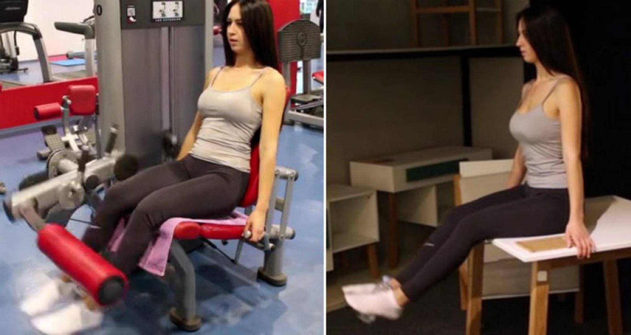 3. Sjednite na stol i podižite noge tako da bočicu s vodom držite među stopalima.