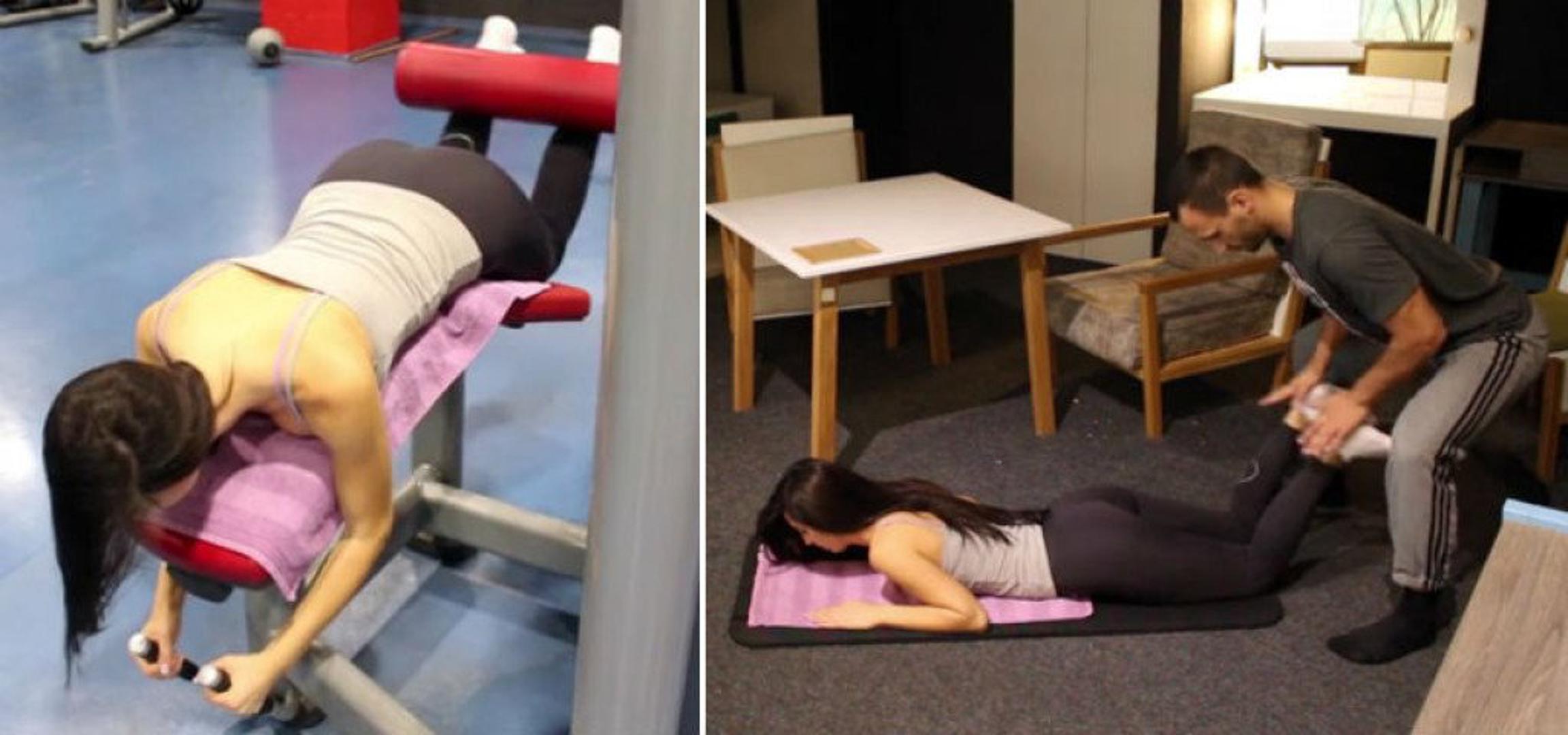 4. Legnite na pod i podižite noge u koljenima dok vam pomagač svojim rukama položenima na vaše pete stvara otpor poput utega.