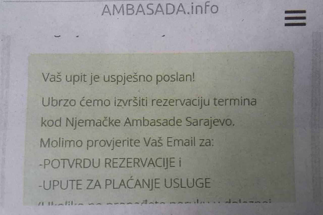 - Rezervirala sam termin prošle godine u kolovozu. S tim da sam zaboravila šifru i jučer sam rezervirala s nova dva e-maila, ali mi nije došao povratni e-mail od Veleposlanstva. Danas sam vratila e-mail i sada me zanima vrijedi li i dalje prva rezervacija? - glasi objavljeni post. Nakon nekoliko komentara u kojima su članovi izrazili nevjericu, osoba je objavila fotografiju odgovora koji je dobila prilikom “rezervacije” na stranici ambasada.info. Odmah su uslijedila upozorenja da će biti prevarena jer to nije stranica njemačkog Veleposlanstva te da će ostati bez novca. Podsjetimo, Odjel za vize njemačkog Veleposlanstva u srpnju je jasno ukazao na to da je zakazivanje termina za podnošenje zahtjeva za vizu besplatno i da se oni mogu rezervirati isključivo putem online sustava Veleposlanstva za zakazivanje termina, istaknuli su tada u Veleposlanstvu. ”Veleposlanstvo ne surađuje s agencijama ni s web-stranicom www.ambasada.info te savjetuje da ne angažirate agencije za zakazivanje termina”, naveli su.