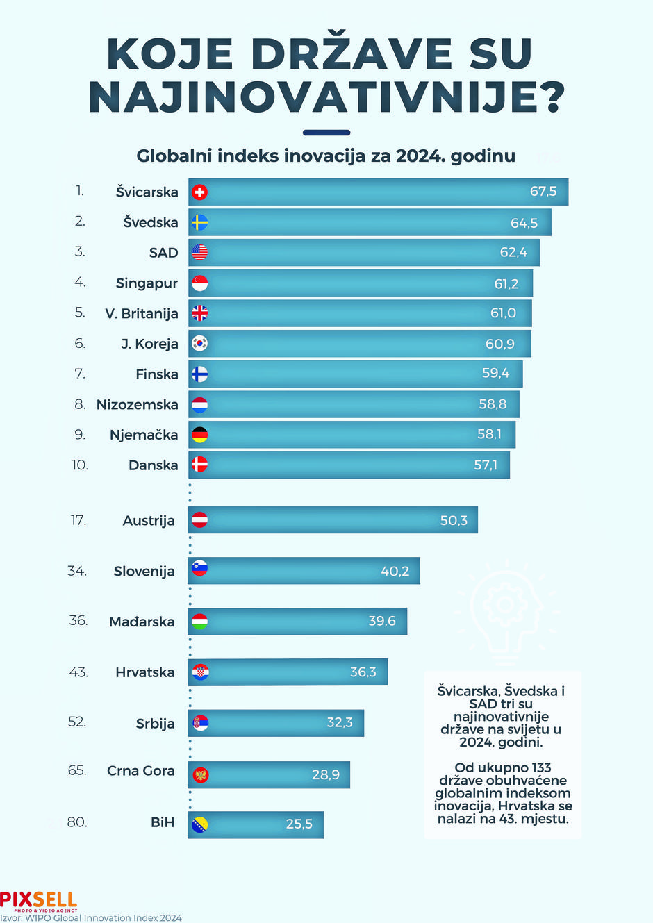 Prošle godine Švicarska se također našla na prvom mjestu zahvaljujući politici poslovanja i obujmu prijava patenata. Švedska je 2023. godine zauzela drugo mjesto zbog izvrsnosti u poslovnoj sofisticiranosti, zapošljavanju s intenzivnim znanjem i istraživačima po glavi stanovnika. SAD je zauzeo treće mjesto u ukupnom poretku, imao je najviše ocjene primljenog rizičnog kapitala, globalnih investitora u korporativno istraživanje i razvoj (R&D) te ukupne vrijednosti jednoroga, odnosno startupova koji su postali vrijedni više od jedne milijarde dolara. Bosna i Hercegovina prošle je godine zauzela 77. mjesto na ovoj listi, Hrvatska 44., Srbija 53., a Crna Gora 75.