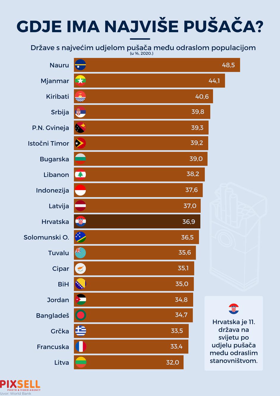 Pixsell je izradio infografiku država s najvećim brojem pušača među odraslom populacijom izraženu u postocima i prema podacima iz 2020. godine. Bosna i Hercegovina je na 15. mjestu s 35% pušača, dok prva tri mjesta drže Nauru, Mjanmar i Kiribati. Srbija je na četvrtom mjestu. U toj susjednoj državi puši 38,9 posto odraslog stanovništva. Lošije pozicionirana od BiH je i Hrvatska. Hrvatska je, naime, na 11. mjestu s 37% pušača. Iako BiH bilježi nešto manje pušača, 35,5% među populacijom starijom od 15 godina, taj postotak je i dalje mnogo viši od europskog prosjeka.