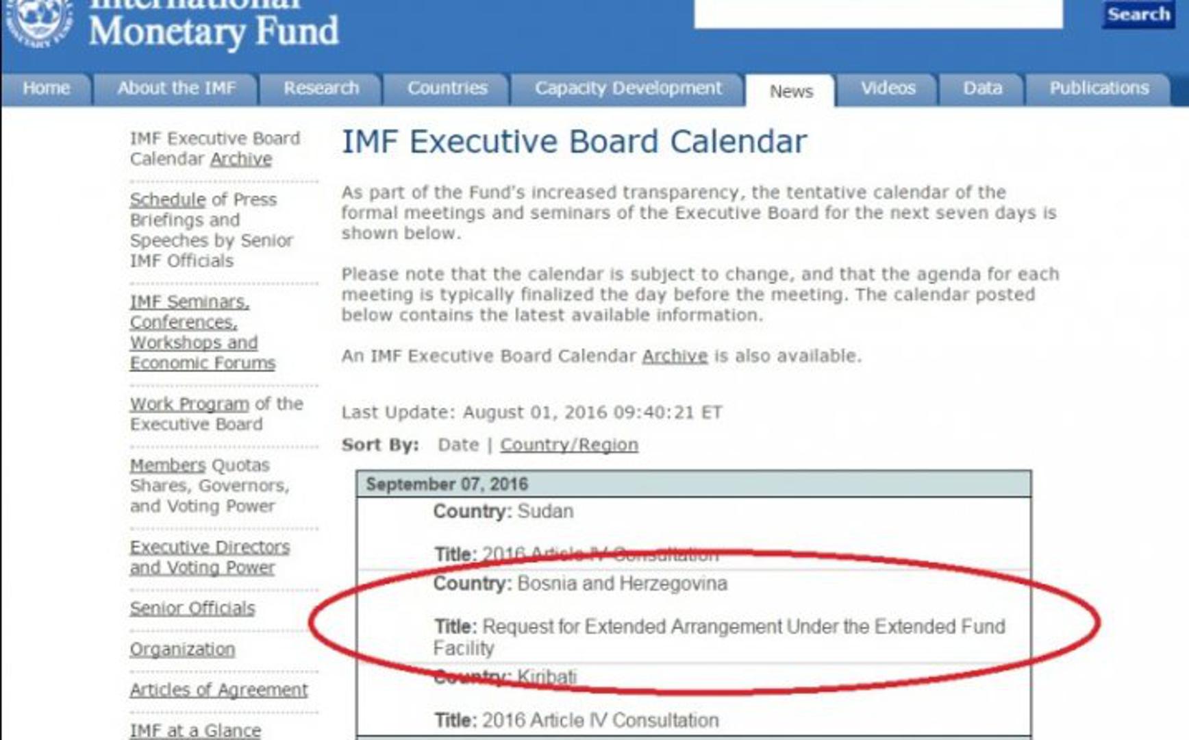 Izvršni odbor direktora Međunarodnog monetarnog fonda zakazao je sjednicu na kojoj će razmatrati novi, povoljniji kreditni aranžman za Bosnu i Hercegovinu težak milijardu i 75 milijuna maraka, doznaje Dnevni avaz.