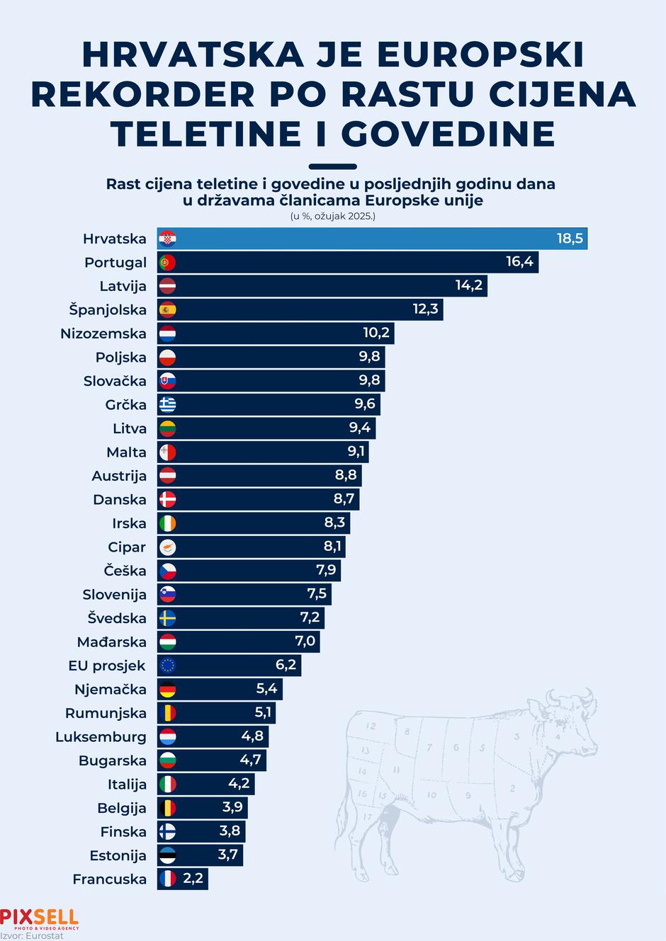 Prema podacima za ožujak ove godine, Hrvatska bilježi najveći porast cijena teletine i junetine među svim članicama Europske unije. U usporedbi s istim razdobljem prethodne godine, a prema europskim parametrima i istraživanjima cijena mesa, cijene ovih vrsta mesa u Hrvatskoj porasle su za čak 18,5 posto, čime je Hrvatska postala europski rekorder po rastu cijena u toj kategoriji. Nakon nje su Portugal i Latvija, dok je na dnu ljestvice Francuska, u kojoj su cijene više za svega 2,2 posto. Veći rast od Hrvatske, kada su u pitanju cijene mesa u regiji, bilježi samo BiH.