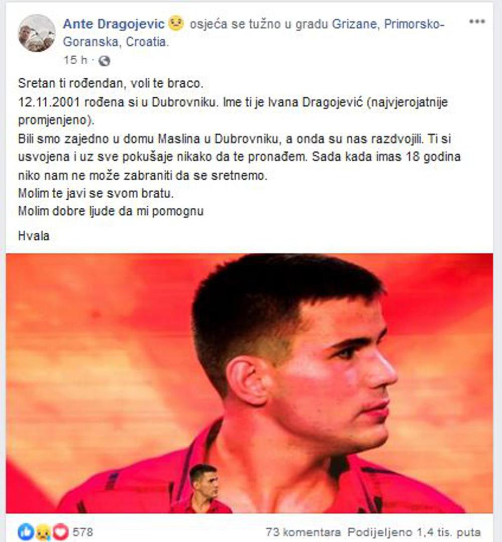 - Sretan ti rođendan, voli te braco - započeo je Ante koji je u domu bio do svoje šeste godine nakon čega je smješten u udomiteljsku obitelj. - 12.11.2001 rođena si u Dubrovniku. Ime ti je Ivana Dragojević (najvjerojatnije promijenjeno). Bili smo zajedno u domu Maslina u Dubrovniku, a onda su nas razdvojili. Ti si usvojena i uz sve pokušaje nikako da te pronađem. Sada kada imaš 18 godina nitko nam ne može zabraniti da se sretnemo. Molim te javi se svom bratu - napisao je Ante i zamolio dobre ljude za pomoć. Mnogi su odmah nudili savjete za pomoć u komentarima, a njegova je objava u manje od 24 sata podijeljena više do 1500 puta na Facebooku.