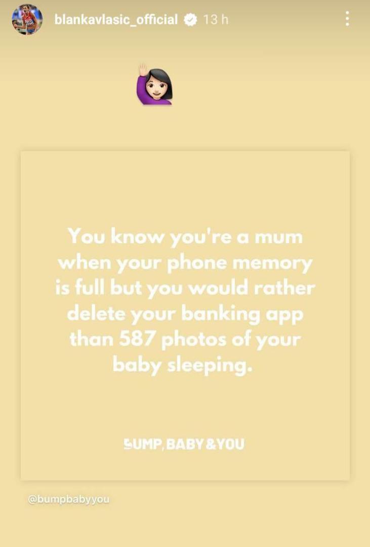 - Znaš da si majka kada ćeš s mobitela radije izbrisati aplikaciju svoje banke, nego 587 fotografija svoga djeteta dok spava - objavila je na Instagram Storyju.
