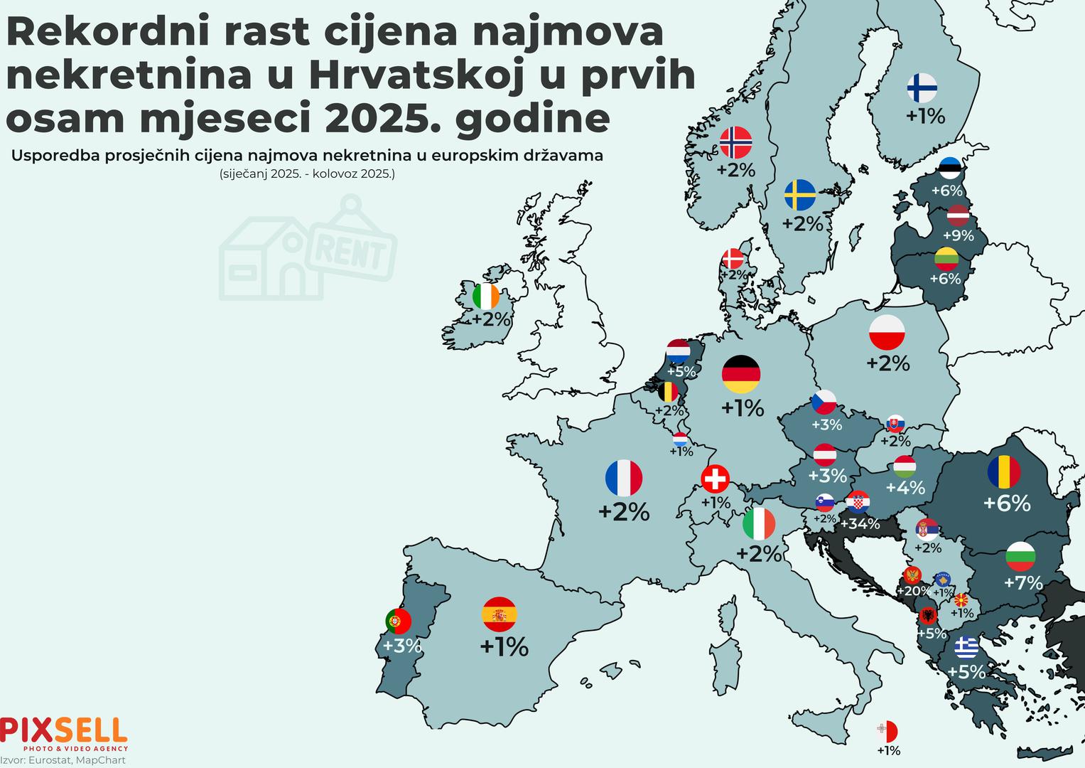 Prema najnovijim podacima za prvih osam mjeseci 2025. godine, Hrvatska je zabilježila rekordan rast cijena najma nekretnina na europskoj razini, s ogromnih 34% više u odnosu na početak godine. Usporedba prosječnih najamnina u europskim državama otkriva da nakon Hrvatske slijede Crna Gora (20%), Bugarska (7%), Rumunjska (6%) i baltičke države poput Estonije i Litve (6%) te Latvije (9%). Većina zapadnoeuropskih zemalja bilježi znatno skromnije povećanje – najviše Nizozemska (5%), dok Njemačka, Švicarska, Španjolska i Finska ne prelaze rast od 1%. Francuska, Italija i Slovenija zadržale su umjeren rast od 2%, a u Portugalu, Austriji i Češkoj cijene su narasle za 3%.