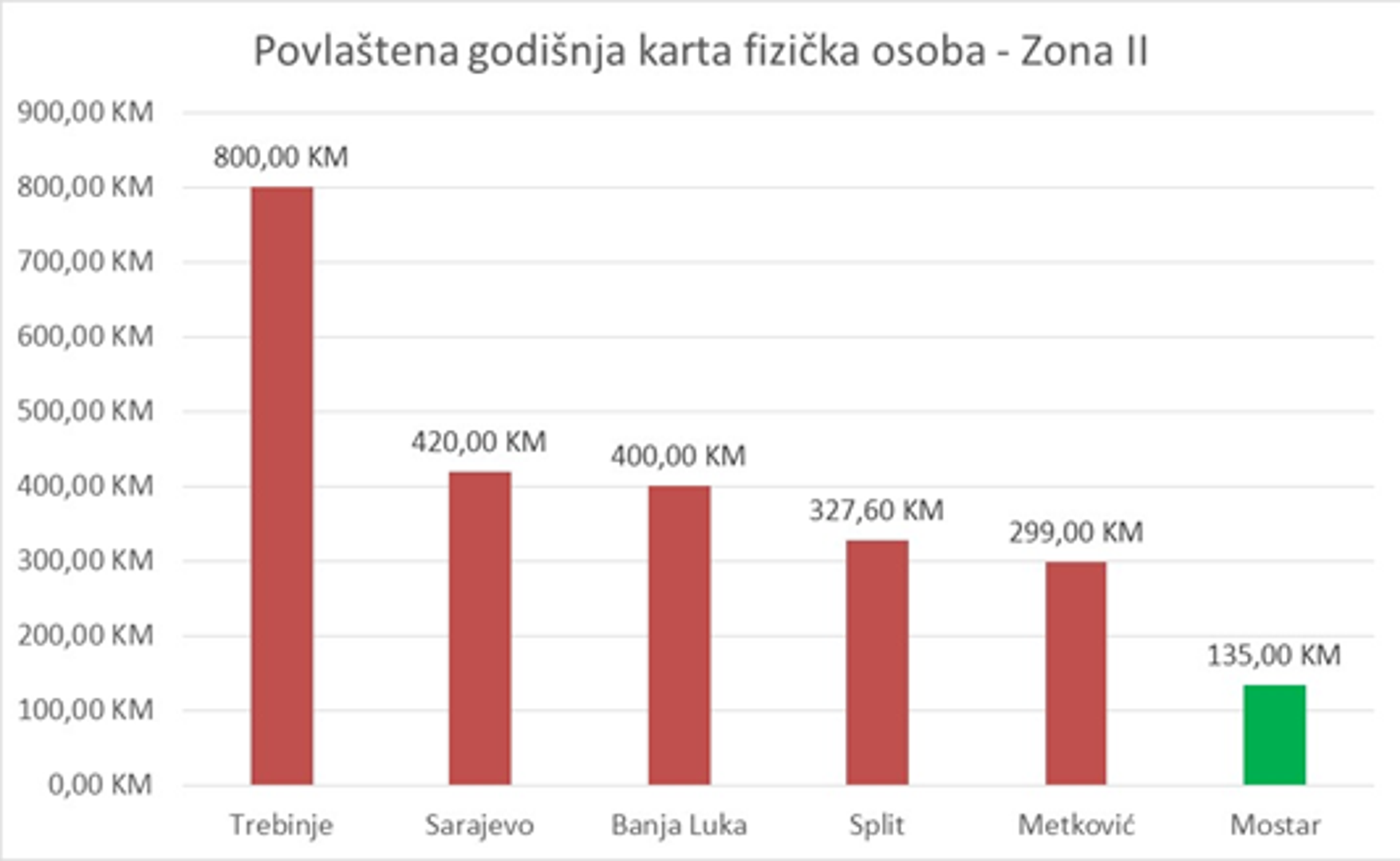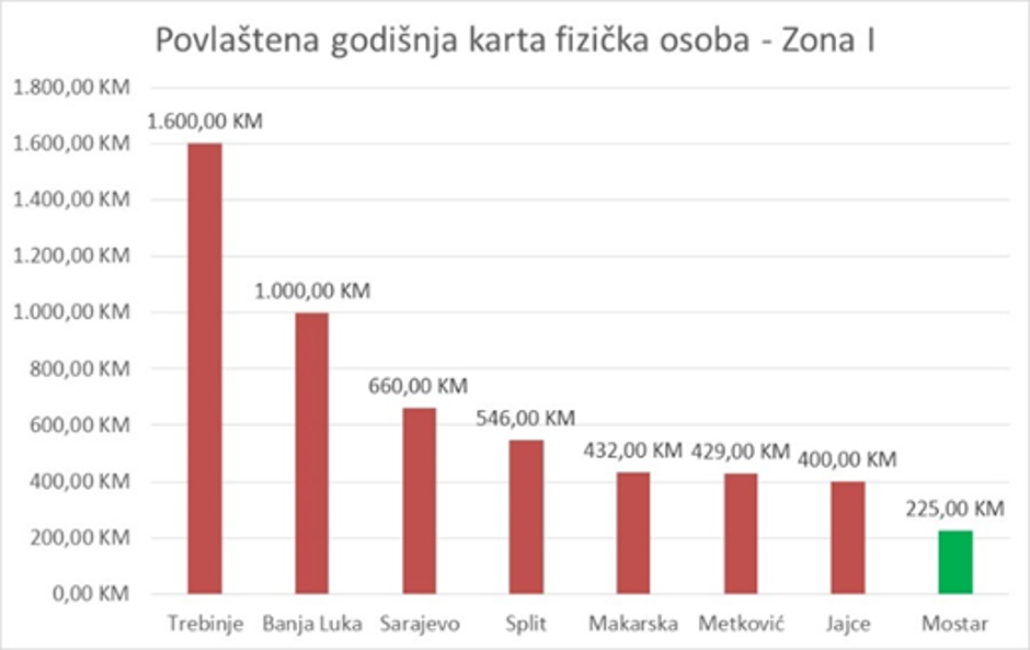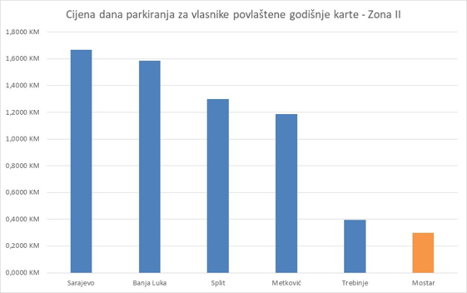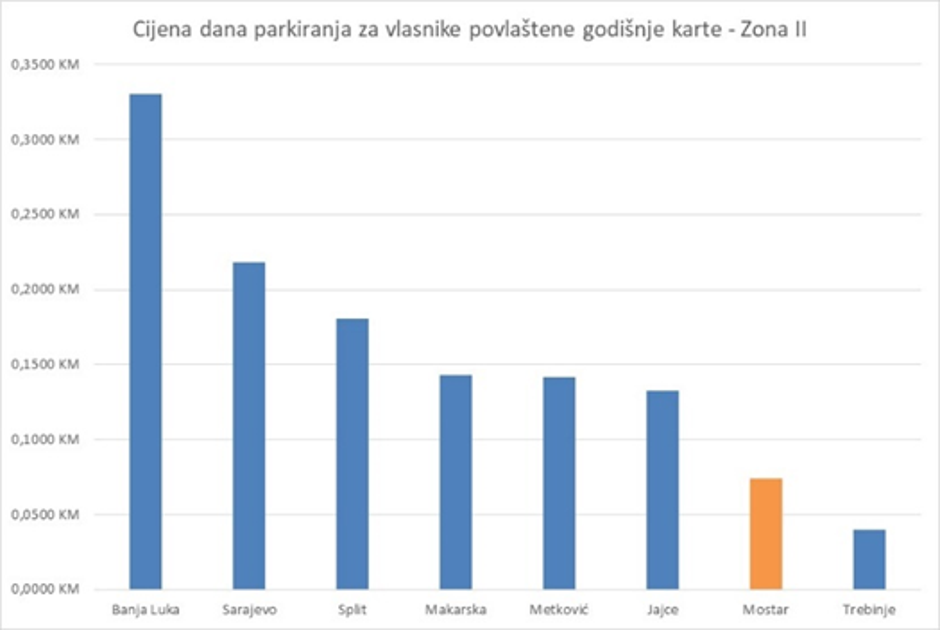 Cijenu godišnje karte građane Mostara na svim na svim otvorenim parkiralištima u Mostaru košta 225 KM, dok je cijena za isto u Banja Luci 1.000,00 KM, Sarajevo 600,00 KM. U Mostaru je najjeftiniji parking za građane koji se odluče kupiti godišnju kartu za I. ili II. Zonu.