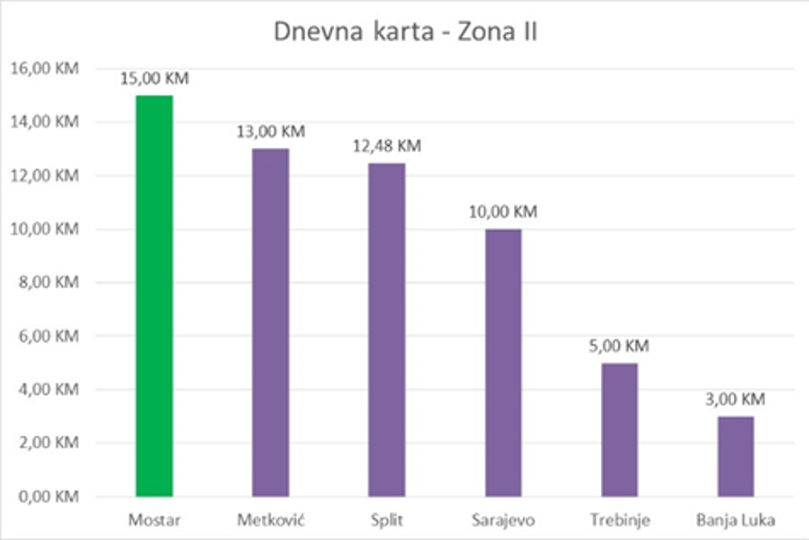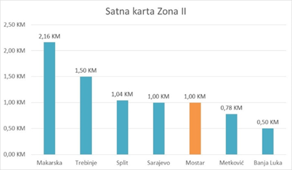 Cijene satne karte u Zoni II. u Mostaru iznosi 1,00 KM. U ovoj kategoriji najjeftinija je karta u Banja Luci i iznosi 0,50 KM po započetom satu i ograničena je na jedan sat.