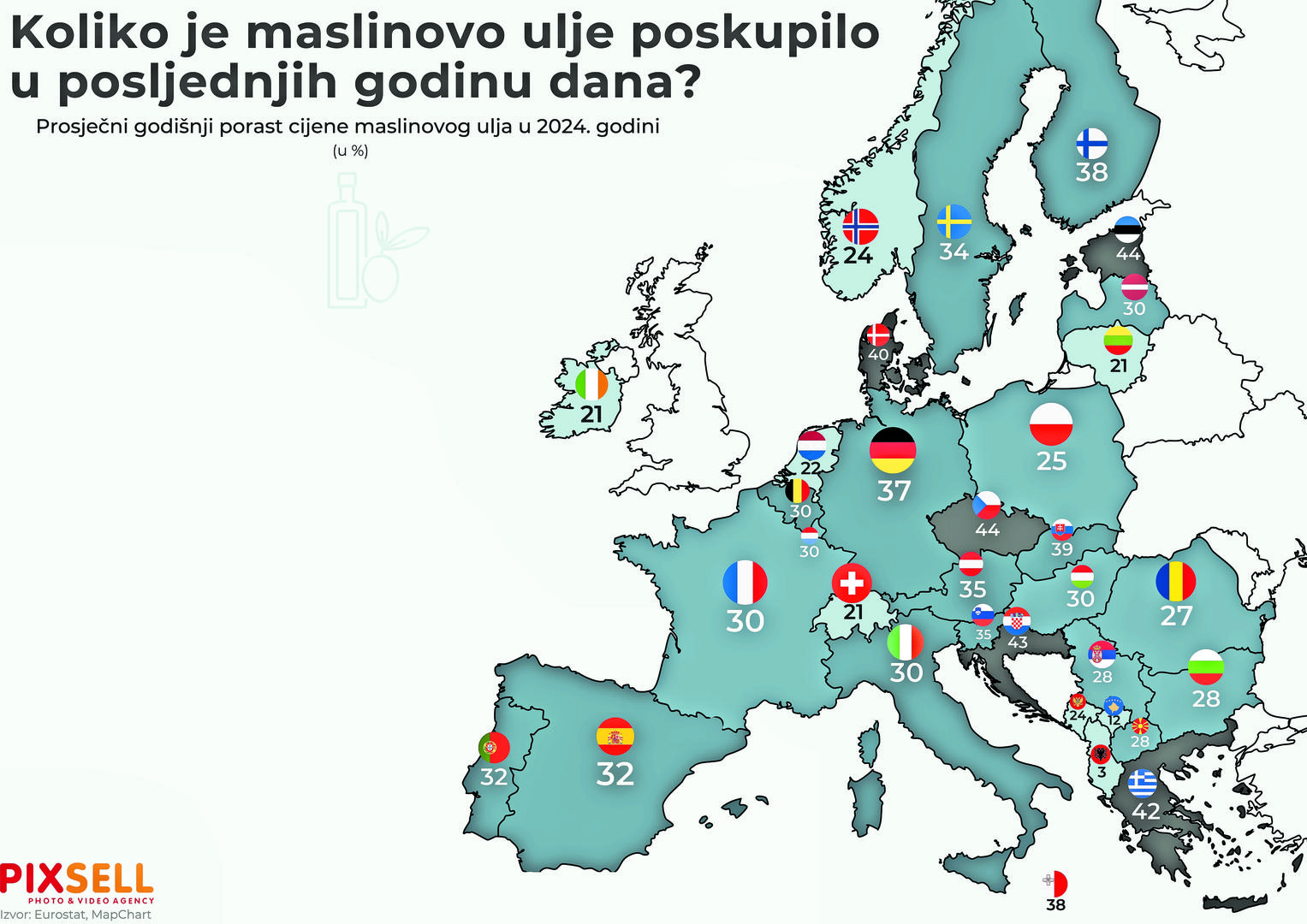 Nepovoljni vremenski uvjeti i problemi s urodom te rast potražnje doveli su do rekordno visokih cijena maslinova ulja na europskom tržištu tijekom 2024. godine. Prema Eurostatovim podacima, ova je namirnica tijekom 2024. godine u odnosu na 2023. godinu najviše poskupjela u Estoniji i Češkoj (44 posto), a zatim u Hrvatskoj (43 posto) te Grčkoj (42 posto). Prema podacima prikazanima u infografici, najmanja su poskupljenja zabilježena u Albaniji (tri posto), na Kosovu (12 posto) te u Irskoj, Švicarskoj i Litvi (21 posto).