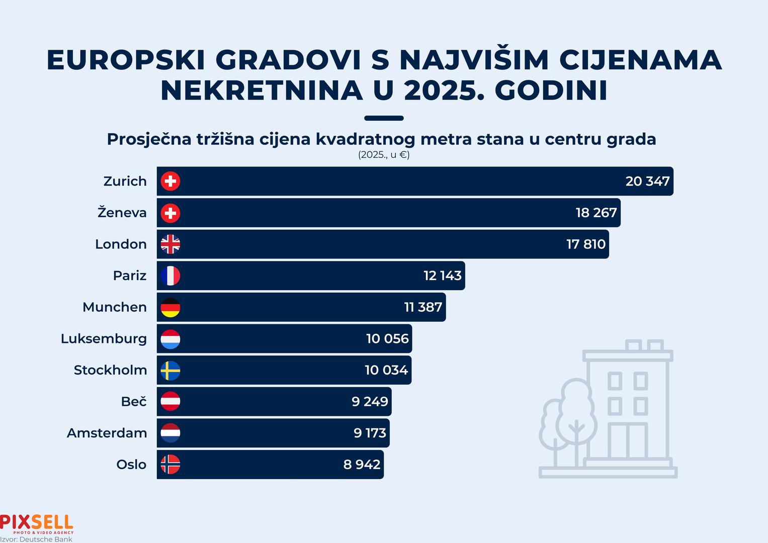 Švicarski gradovi su na vrhu ljestvice najskupljih europskih gradova prema cijenama nekretnina u središtu grada. Prosječna tržišna cijena četvornog metra stana u Zürichu iznosi čak 20.347 eura, što ga čini najskupljim gradom za kupnju nekretnina u Europi. Slijedi Ženeva s prosječnom cijenom od 18.267 eura po četvornom metru. London se nalazi na trećem mjestu s cijenom od 17.810 eura, dok je Pariz četvrti s 12.143 eura. Među deset najskupljih gradova ulaze i München (11.387 €), Luksemburg (10.056 €), Stockholm (10.034 €), Beč (9249 €), Amsterdam (9173 €) te Oslo s najnižom cijenom na ovoj listi, 8942 eura po četvornom metru.