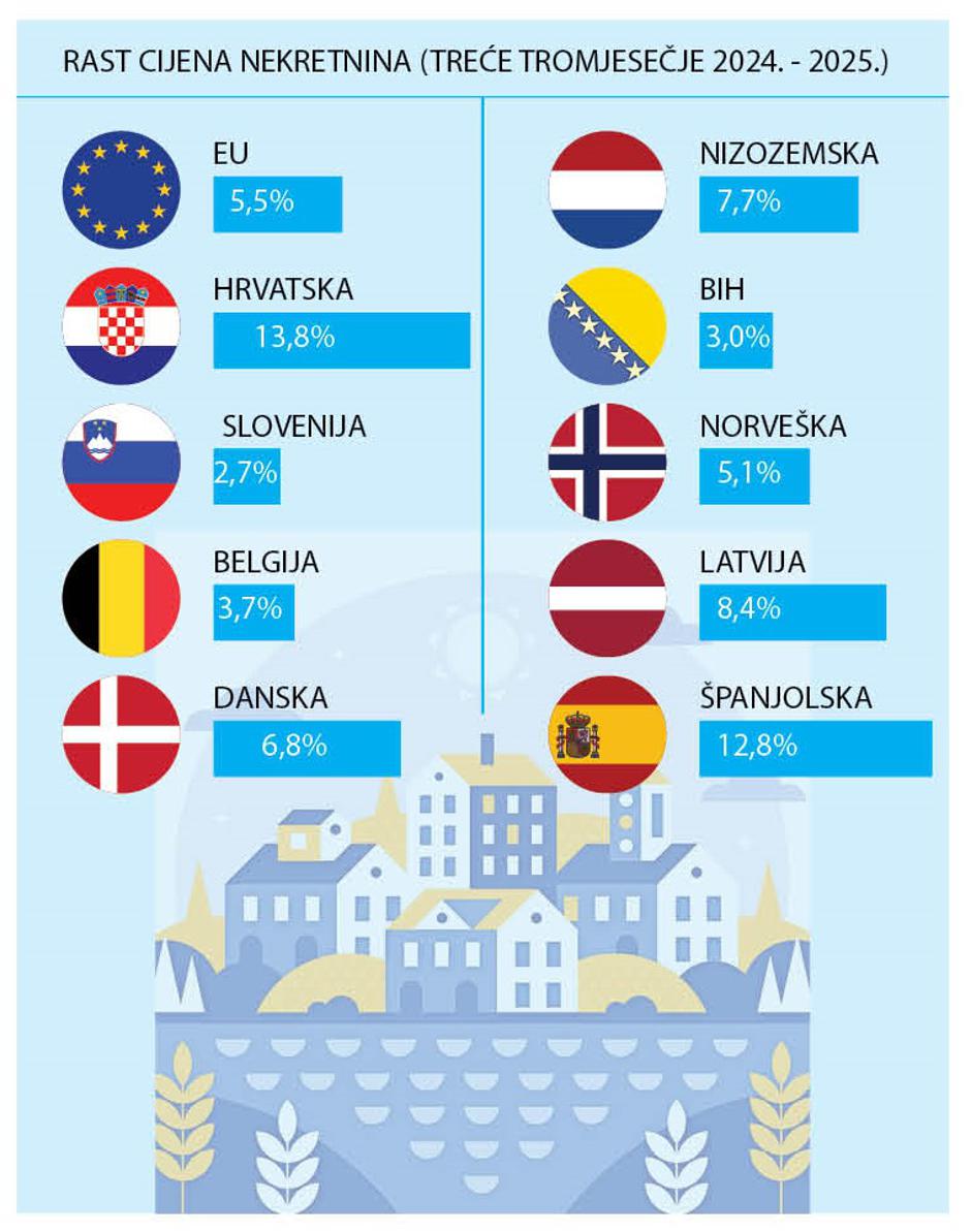 U trećem tromjesečju 2025. godine cijene nekretnina u Europskoj uniji porasle su za 5,5 posto, dok su stanarine povećane za 3,1 posto u usporedbi s trećim tromjesečjem 2024. godine.