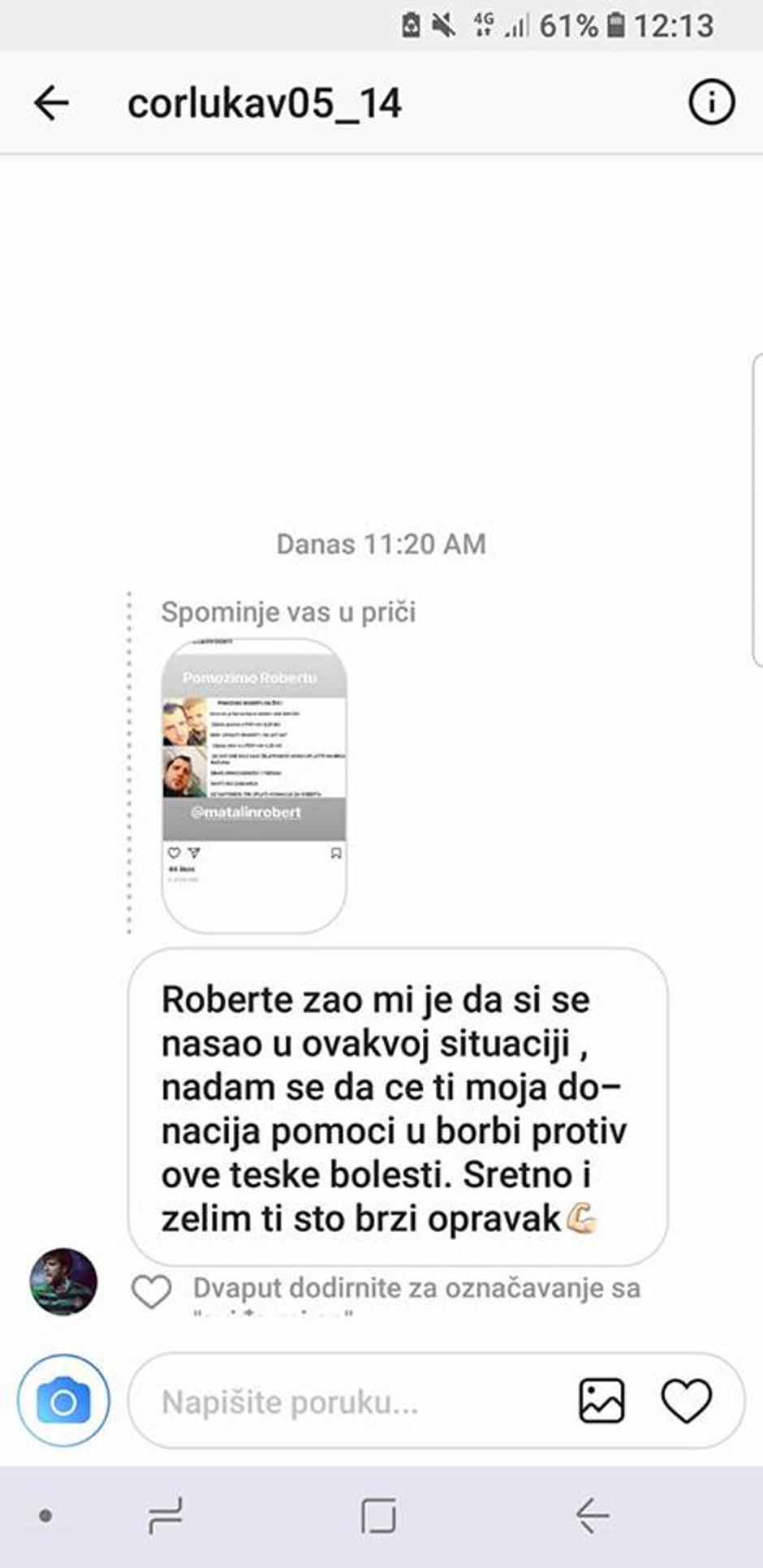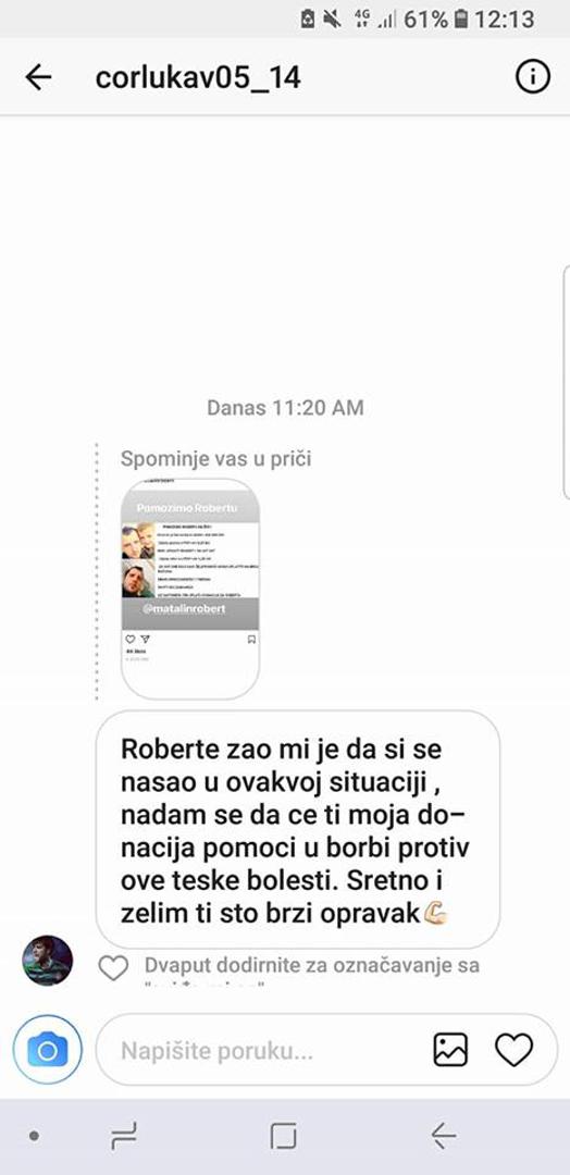 "Roberte, žao mi je što si se našao u ovakvoj situaciji, nadam se da će ti moja donacija pomoći u borbi protiv ove teške bolesti. Sretno i želim ti što brži oporavak", napisao mu je Ćorluka.