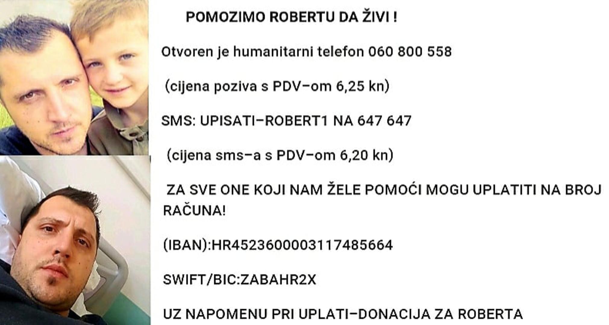 Budući da još uvijek nije pronađen podudarni donor za Roberta, kojem je preostalo otprilike godinu dana života, njegovi najbliži su otvorili Facebook stranicu putem koje skupljaju za liječenje u Klinici Acibadem u Istanbulu u Turskoj koja radi haploidentičnu transplantaciju koštane srži, prenosi Index.hr.