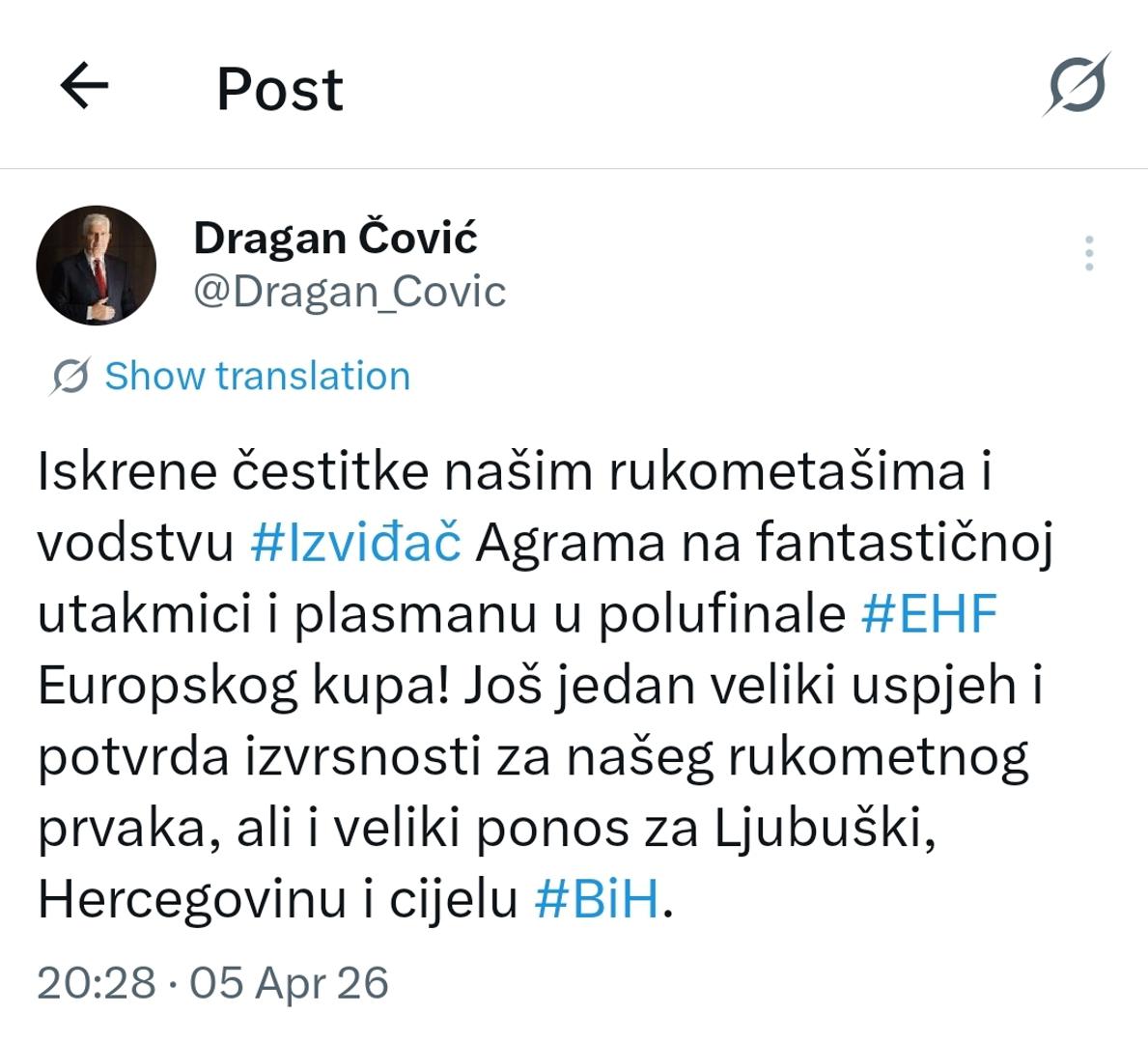Nakon što se Izviđač Agram plasirao u polufinale EHF Europskog kupa, Dragan Čović predsjednik HNS-a i HDZ-a uputio je čestitku rukometašima i vodstvu kluba.