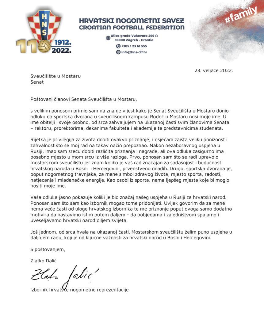 Još jednom, od srca hvala na ukazanoj časti. Mostarskom sveučilištu želim puno uspjeha u daljnjem radu, koji je od ključne važnosti za hrvatski narod u Bosni i Hercegovini", stoji u pismu koje potpisuje Zlatko Dalić.