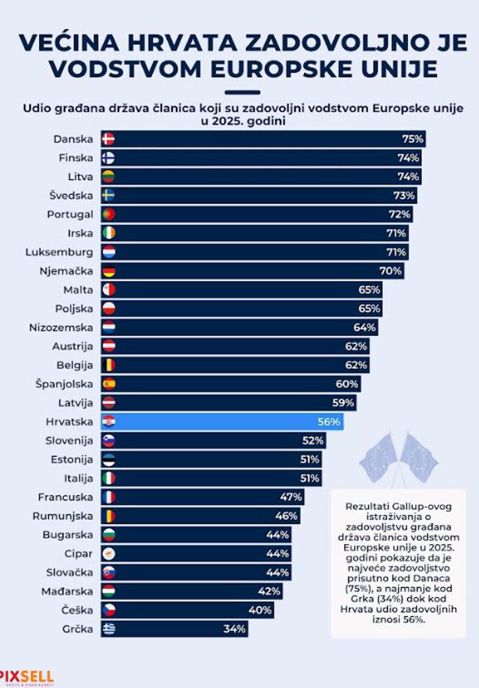 Infografika prikazuje rezultate Gallupova istraživanja o zadovoljstvu građana država članica vodstvom Europske unije u 2025. godini pokazuju da je najveće zadovoljstvo prisutno kod Danaca (75%), a najmanje kod Grka (34%), dok kod Hrvata udio zadovoljnih iznosi 56%.