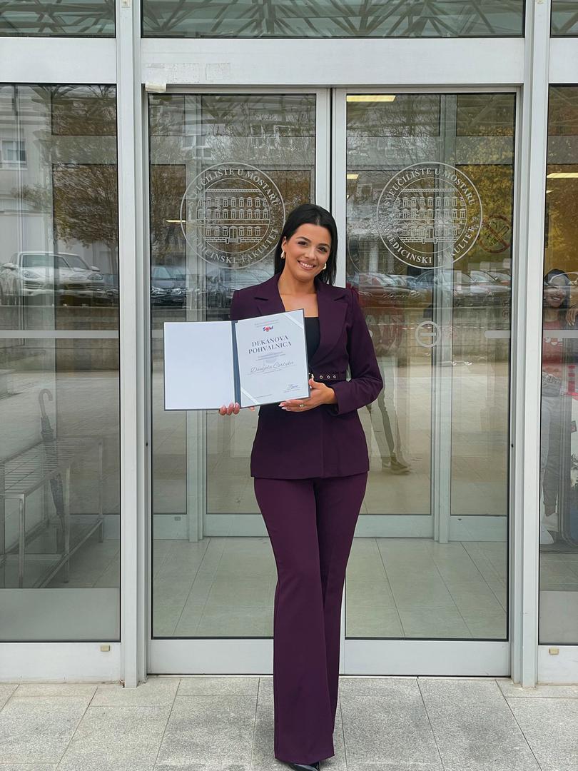 Danijela Ćorluka, studentica pete godine Medicinskog fakulteta Sveučilišta u Mostaru, ovogodišnja je dobitnica Dekanove pohvalnice za izvannastavni uspjeh i doprinos promociji fakulteta za akademsku godinu 2024./2025.