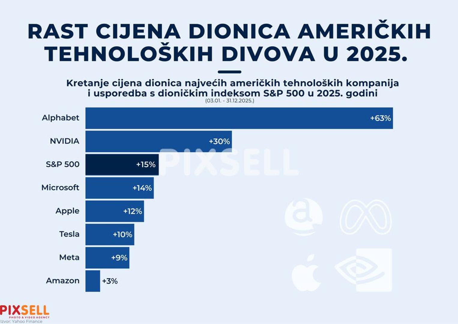 Infografika prikazuje rast cijena dionica najvećih američkih tehnoloških kompanija u 2025. godini i uspoređuje ih s indeksom S&P 500.