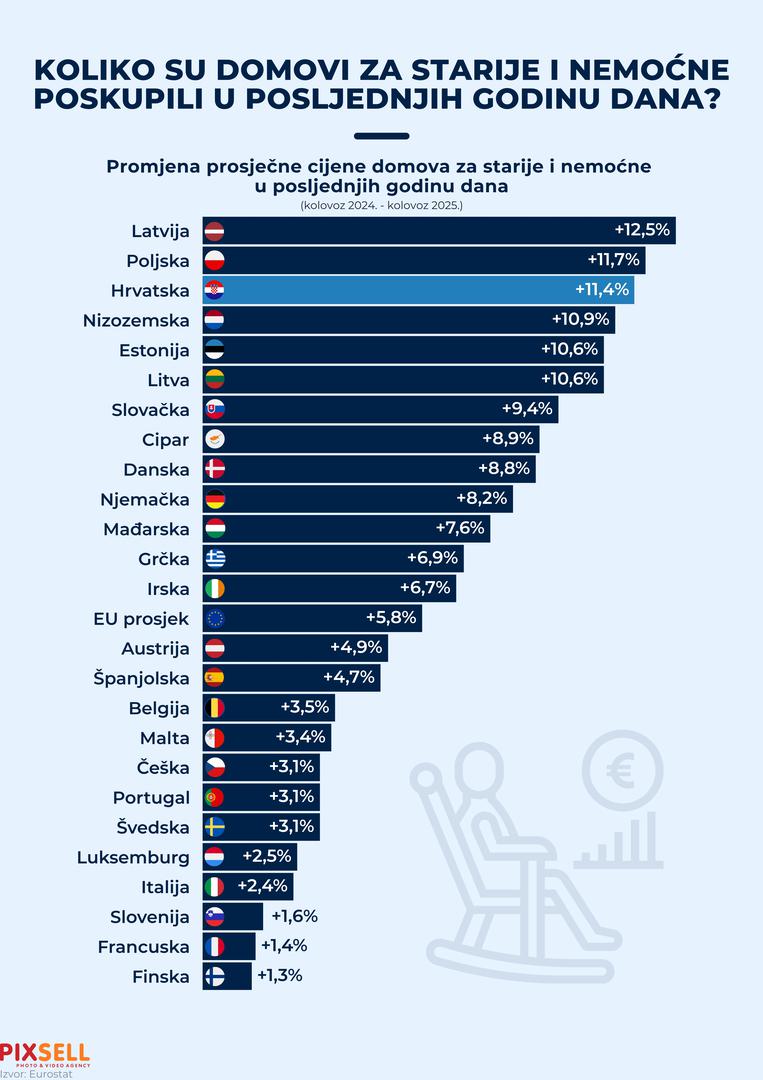 Cijene smještaja u domovima za starije i nemoćne u Europskoj uniji znatno su porasle od kolovoza 2024. do kolovoza 2025. Najveći rast bilježi Latvija s poskupljenjem od 12,5 posto, slijede Poljska s 11,7 i Hrvatska s 11,4 posto. Iznad prosjeka EU-a, koji iznosi 5,8 posto, nalaze se i Nizozemska (10,9 %), Estonija i Litva (po 10,6 %) te Slovačka (9,4%). Najmanji rast cijena zabilježen je u Finskoj (1,3%), Francuskoj (1,4%) i Sloveniji (1,6%).