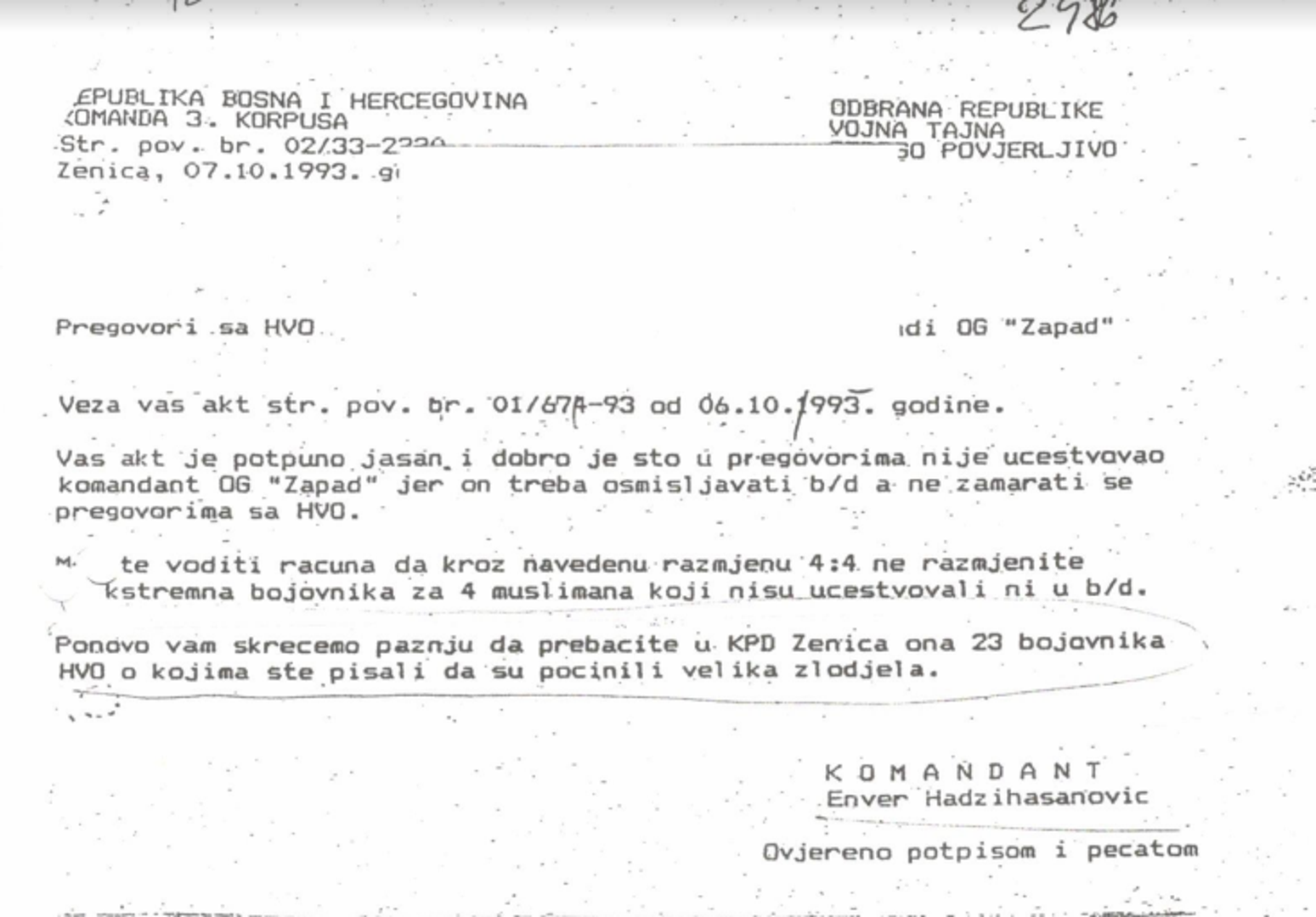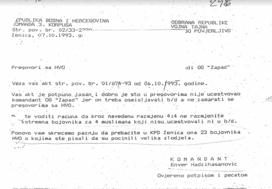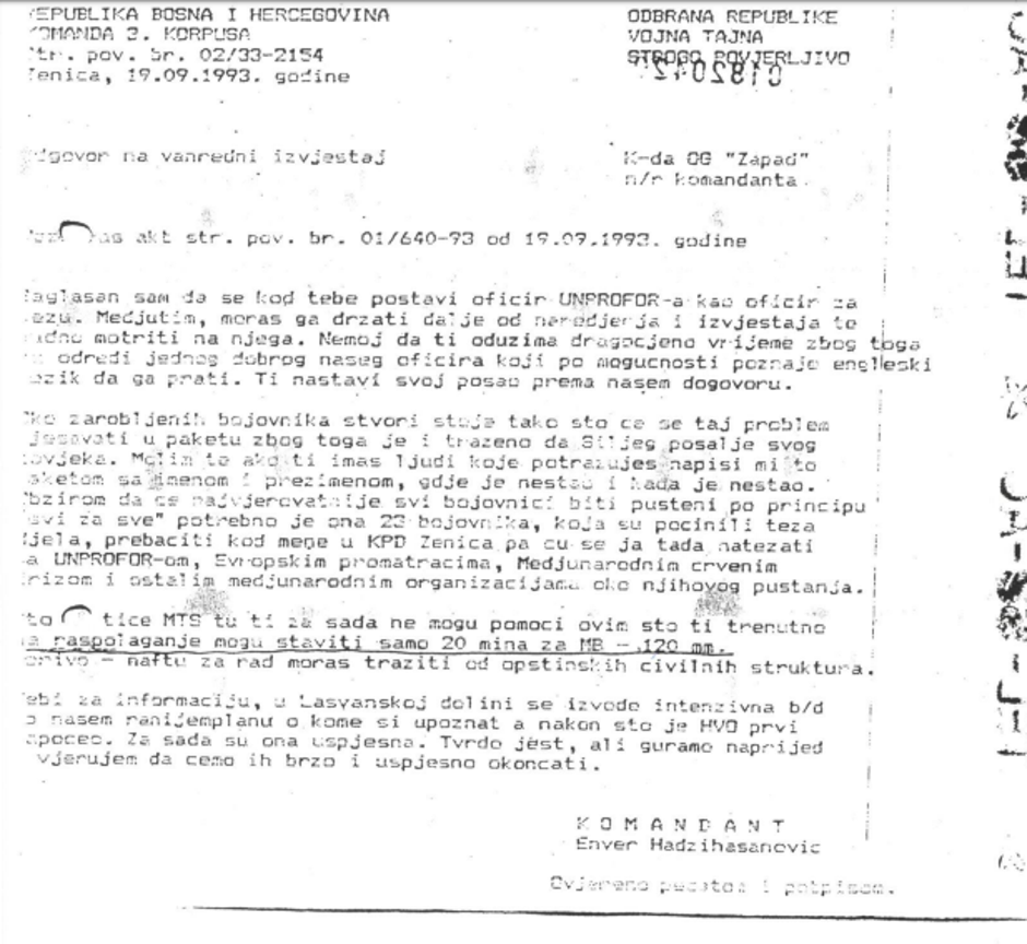 U istom dopisu Hadžihasanović poručuje Cikotiću da je suglasan glede postavljanja časnika UNPROFOR-a za vezu u zoni odgovornosti OG Zapad, ali da ga treba držati dalje od naređenja i izvješća čelnika Armije BiH. “Ti odredi jednog dobrog našeg časnika koji, po mogućnosti, poznaje engleski jezik da ga prati. Ti nastavi svoj posao prema našem dogovoru”, poručio je Cikotiću Hadžihasanović. Posao Cikotića očito je bio i prebaciti 23 hrvatska zarobljenika u Zenicu. Na to ga je Hadžihasanović upozorio i u dopisu od 7. listopada 1993.. “Ponovno vam skrećemo pozornost na to da prebacite ona 23 bojovnika HVO-a o kojima ste pisali da su počinila velika zlodjela”, upozorio je Hadžihasanović Cikotića. Da se Cikotić oglušio na više puta ponovljenu zapovijed nadređenog, potvrđuje izvanredno izvješće adresirano na Zapovjedništvo 3. Korpusa Armije BiH i Zapovjedništvo Operativne skupine Zapad. U njemu se jasno optužuju zapovjednici navedenih postrojbi Hadžihasanović i Cikotić za neispunjavanje obveze prebacivanja 23 hrvatska logoraša iz Bugojna u Zenicu.