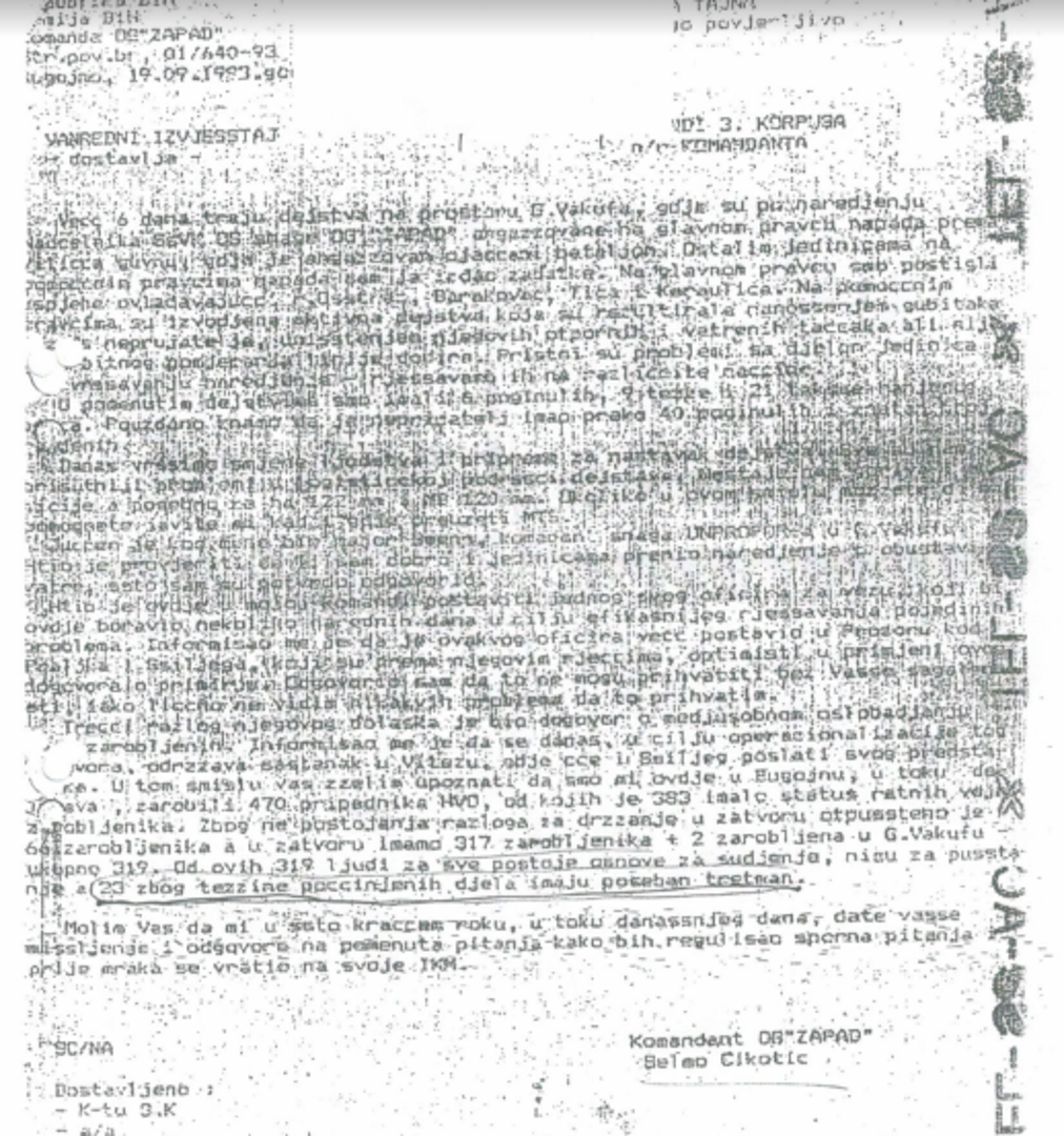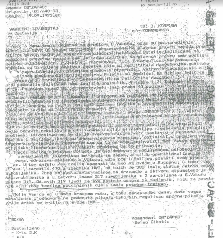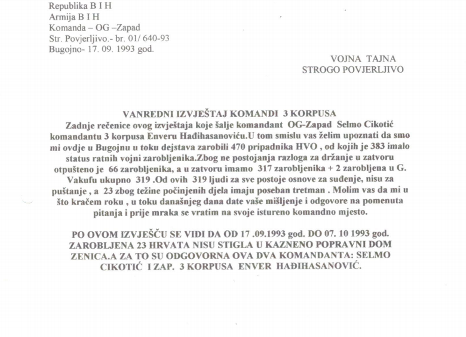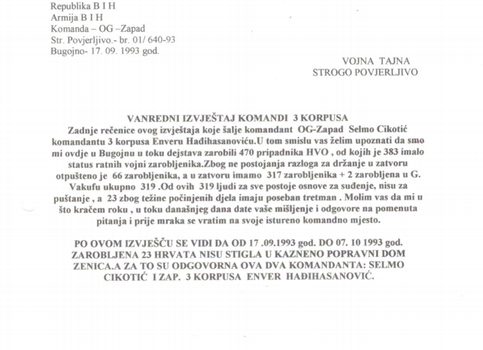Cikotić opisuje stanje u uskopaljskoj dolini, u zoni odgovornosti Operativne skupine Zapad čiji je zapovjednik. Osim borbenih djelovanja na području Gornjeg Vakufa-Uskoplja, Cikotić Hadžihasanovića detaljno informira o zarobljavanju 470 pripadnika HVO-a u Bugojnu te potrebi zadržavanja njih 317, zajedno s dvama zarobljenim pripadnicima HVO-a iz Uskoplja jer, po njegovoj procjeni, za razliku od 66 otpuštenih zarobljenika, ovih 319 su za suđenja i nisu za puštanja. U istom dopisu Cikotić izdvaja “po težini počinjenih djela” skupinu od 23 zarobljenika. Zapovjednik 3. Korpusa Armije BiH Enver Hadžihasanović istog dana u odgovoru Cikotiću traži da 23 zarobljenika prebaci u Kazneno-popravni zavod u Zenicu te će se on (Hadžihasanović), kako navodi u dopisu, “natezati s UNPROFOR-om, europskim promatračima, Međunarodnim crvenim križom i ostalim međunarodnim organizacijama glede njihova puštanja”.