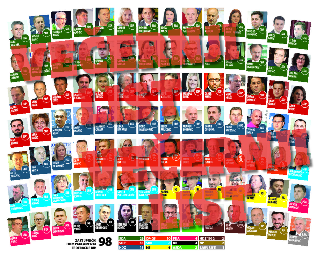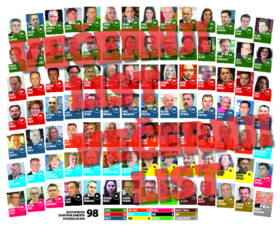 To su sljedeći zastupnici: Salko Bukvarević, Kenela Zuko, Salko Zildžić, Ismet Osmanović, Zijat Mušić, Halima Crnica iz SDA, Lana Prlić, Ivan Boban, Mira Grgić iz SDP-a, Ivan Musa i Delfa Dejanović iz koalicije HNS-a, Dževad Adžem i Amra Kunovac iz DF - GS-a, Munib Jusufović, Sanela Prašović-Gadžo i Šemsudin Kavazović iz SBB-a, Nasiha Pozder, Mirsad Čamdžić, Amela Kuskunović, Sanela Klarić, Želimir Bukarić iz NS-a, Safer Demirović iz PDA, Amer Obradović, Dženana Hodžić, Elmedin Voloder iz NB-a. Prema ovom pregledu, u novom sazivu Zastupničkog doma bit će tridesetak zastupnika koji su prošli zahvaljujući kompenzacijskim mandatima. Kako su pojedine stranke već i objavile, razgovara se o mogućim koalicijama, HDZ BiH je jedini nezaobilazan čimbenik za sastavljanje vlasti u FBiH. U Zastupnički dom Parlamenta BiH prošlo je 12 stranaka. Za parlamentarnu većinu potrebno je 50 zastupnika. Rok za sastavljanje vlasti počinje teći nakon službene objave rezultata izbora od SIP-a BiH. •