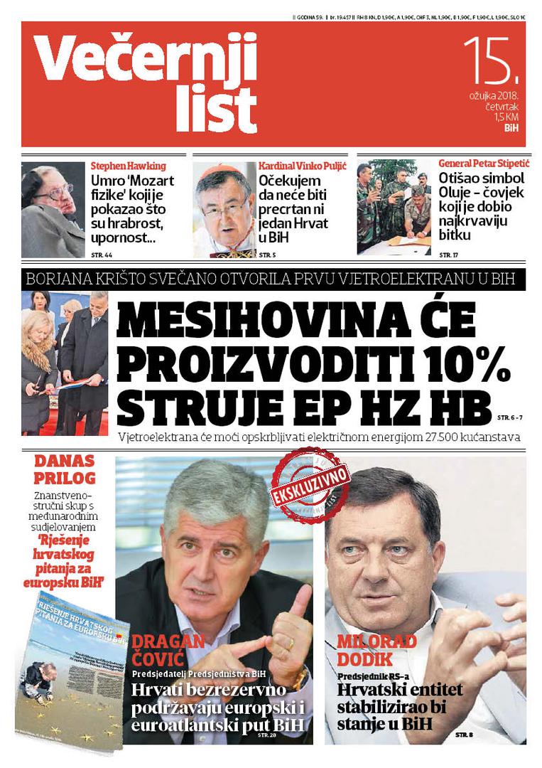 U Večernjem listu BiH u tiskanom izdanju u četvrtak, 15. ožujka 2018. godine čitajte: