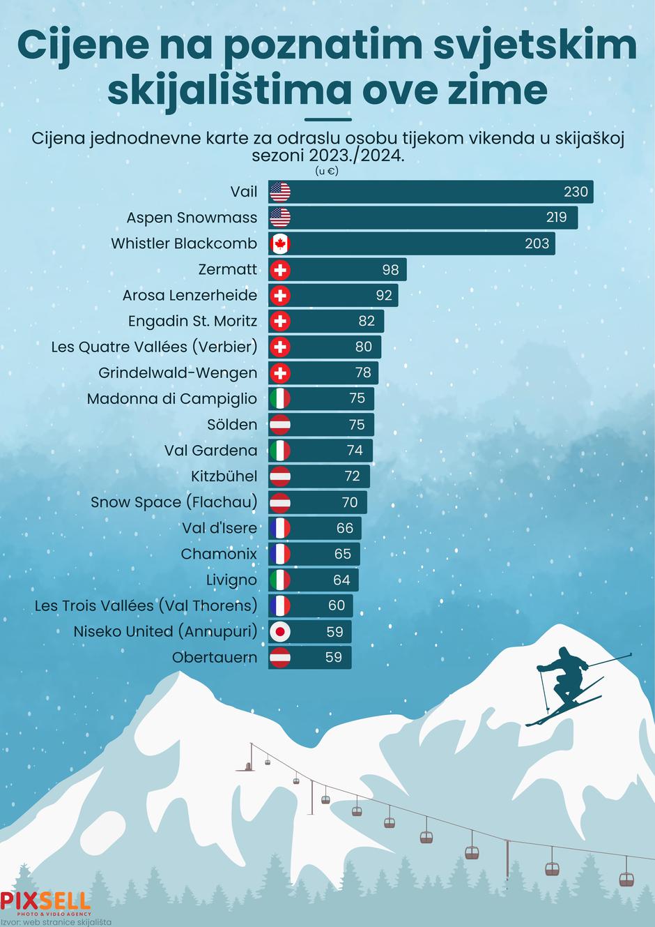 Početkom nove zimske sezone mnogi se vesele snijegu, a posebno oni koji idu na skijaške staze. A najbolje su one u Francuskoj i Austriji. Donosimo popis najboljih skijališta svijeta. Kod ocjene skijališta uzeto je u obzir 14 pokazatelja poput dužine kvalitete staza, kvalitete smještaja, sadržaja nakon skijanja, vrijednosti za novac... Najbolje skijalište na svijetu u ovoj godini je Les Trois Vallees u Francuskoj koje obuhvaća Val Thorens, Les Menuires, Meribel i Courchevel.