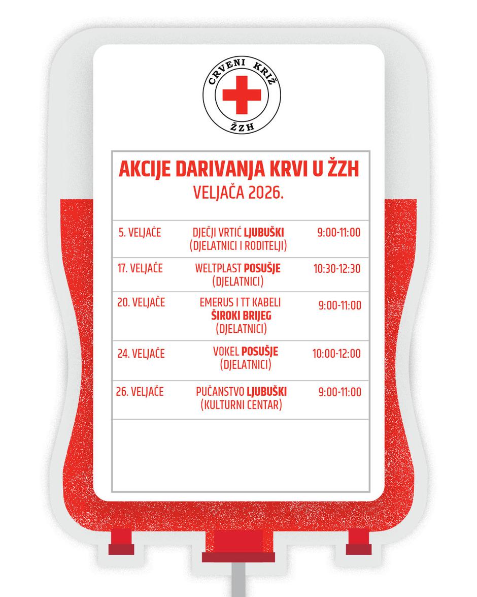 Crveni križ Zapadnohercegovačke županije objavio je raspored akcija dragovoljnog darivanja krvi koje će se tijekom veljače 2026. godine održati na području ZHŽ-a.