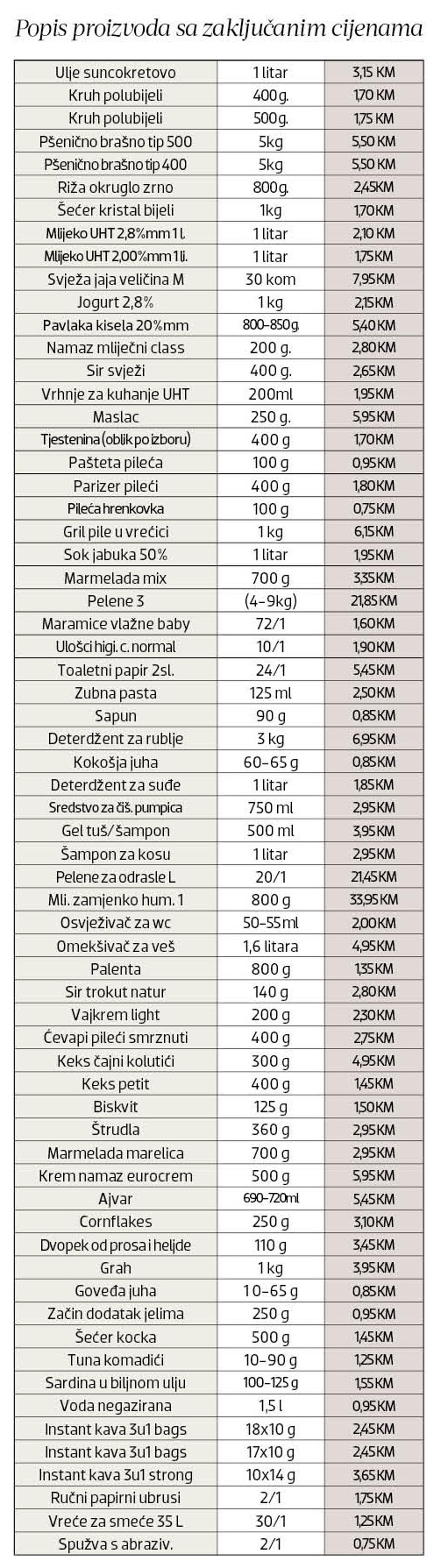 Kako bi se žiteljima Federacije pomoglo u suočavanju s očitim trendovima porasta cijena prehrambenih proizvoda, Vlada FBiH je na hitnoj sjednici donijela odluku kojom je definirala maksimalne cijene za 65 proizvoda, odnosno zaključala ih te podijelila u dvije skupine. Prvu čini 40 proizvoda, od kruha, mlijeka, jaja i sira pa do higijenskih potrepština, a naloženo je da se pravne osobe za svih 40 moraju pridržavati iznosa cijene. Drugu skupinu proizvoda čini 25 artikala, od začina i ribljih proizvoda pa do kave, a od ovoga broja pravne osobe moraju uzeti minimalno 15 artikala i zaključati cijene koje je Vlada odredila.