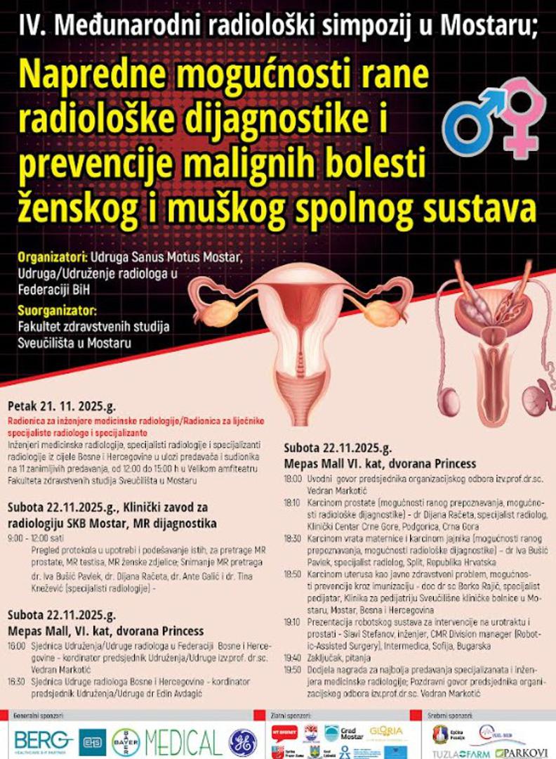 IV. Međunarodni radiološki simpozij pod nazivom "Napredne mogućnosti rane radiološke dijagnostike i prevencije malignih bolesti ženskog i muškog spolnog sustava“ održat će se u petak i subotu, 21. i 22. studenoga u Mostaru (Mepass Mall i Klinički zavod za radiologiju SKB-a Mostar, MR dijagnostika). Nakon uspješne organizacije prethodnih triju o temama dijagnostike osteoartikularnog sustava, moždanog udara i dijagnostike bolesti dojke, predsjednik Organizacijskog odbora izv. prof. dr. sc. Vedran Markotić, inače predstojnik Kliničkoga zavoda za radiologiju SKB-a Mostar, kaže za vecernji.ba kako simpozij ove godine organizacijski, sadržajno i kvalitetom ide još nekoliko koraka naprijed.