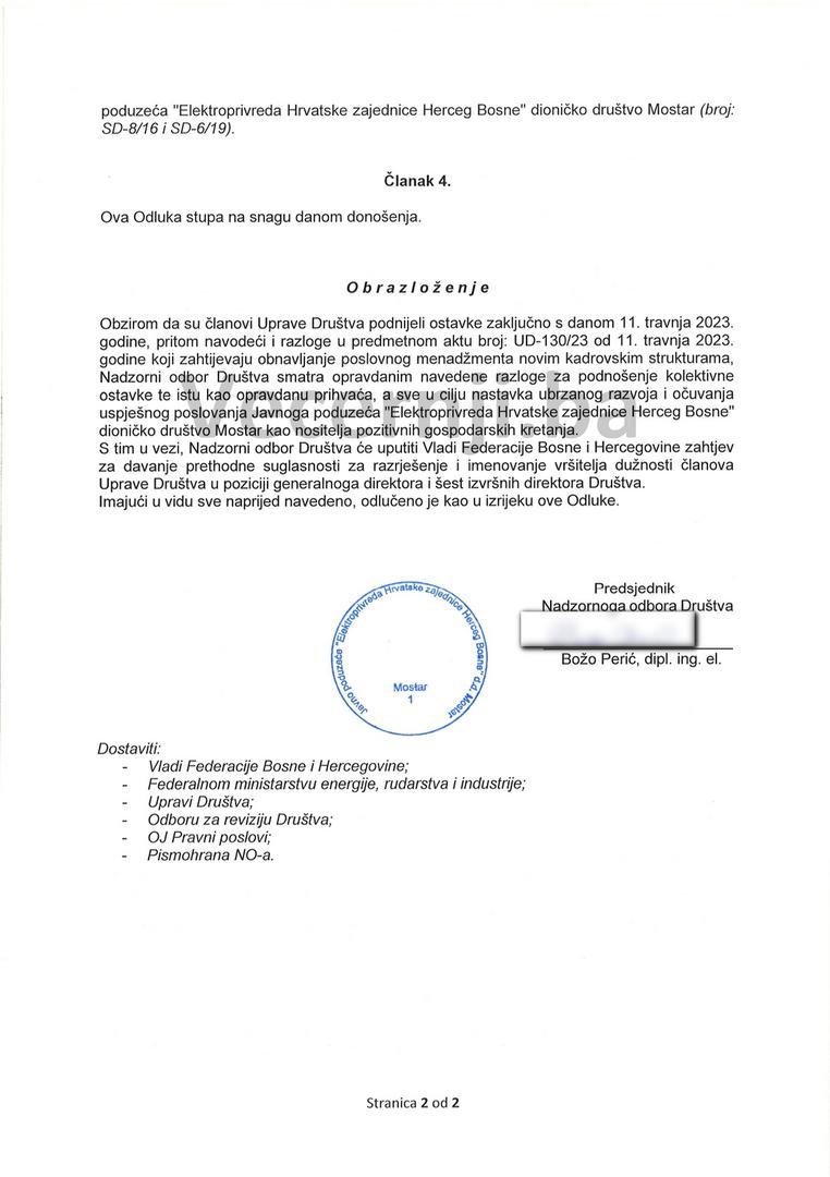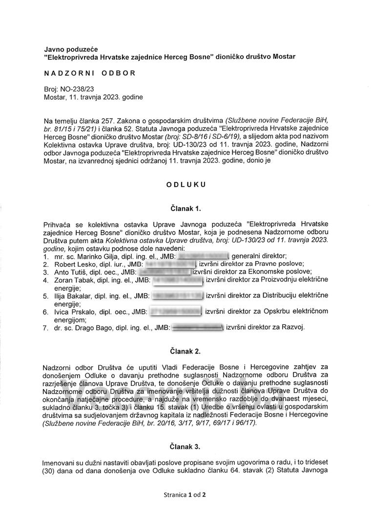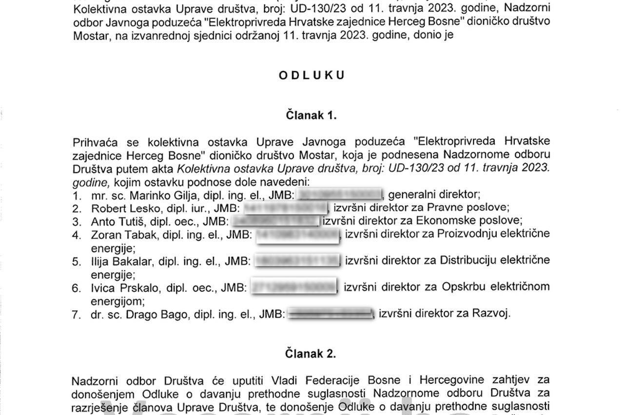 Večernji list je u posjedu priopćenja dosadašnjeg generalnog direktora Elektroprivrede HZ HB Marinka Gilje i odluke Nadzornog odbora o prihvaćanju kolektivne ostavke Uprave društva.
