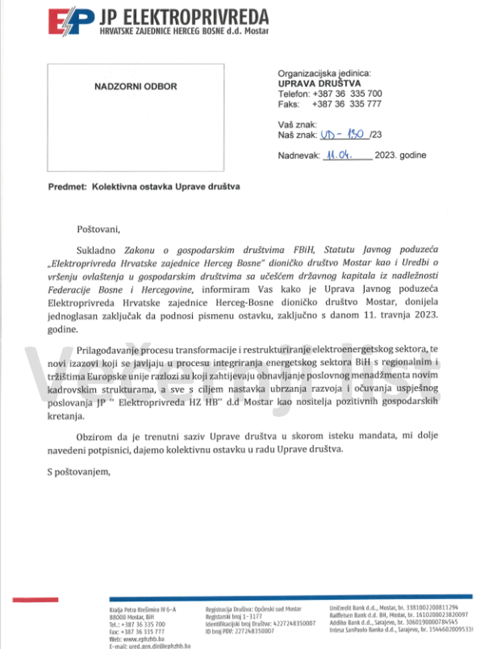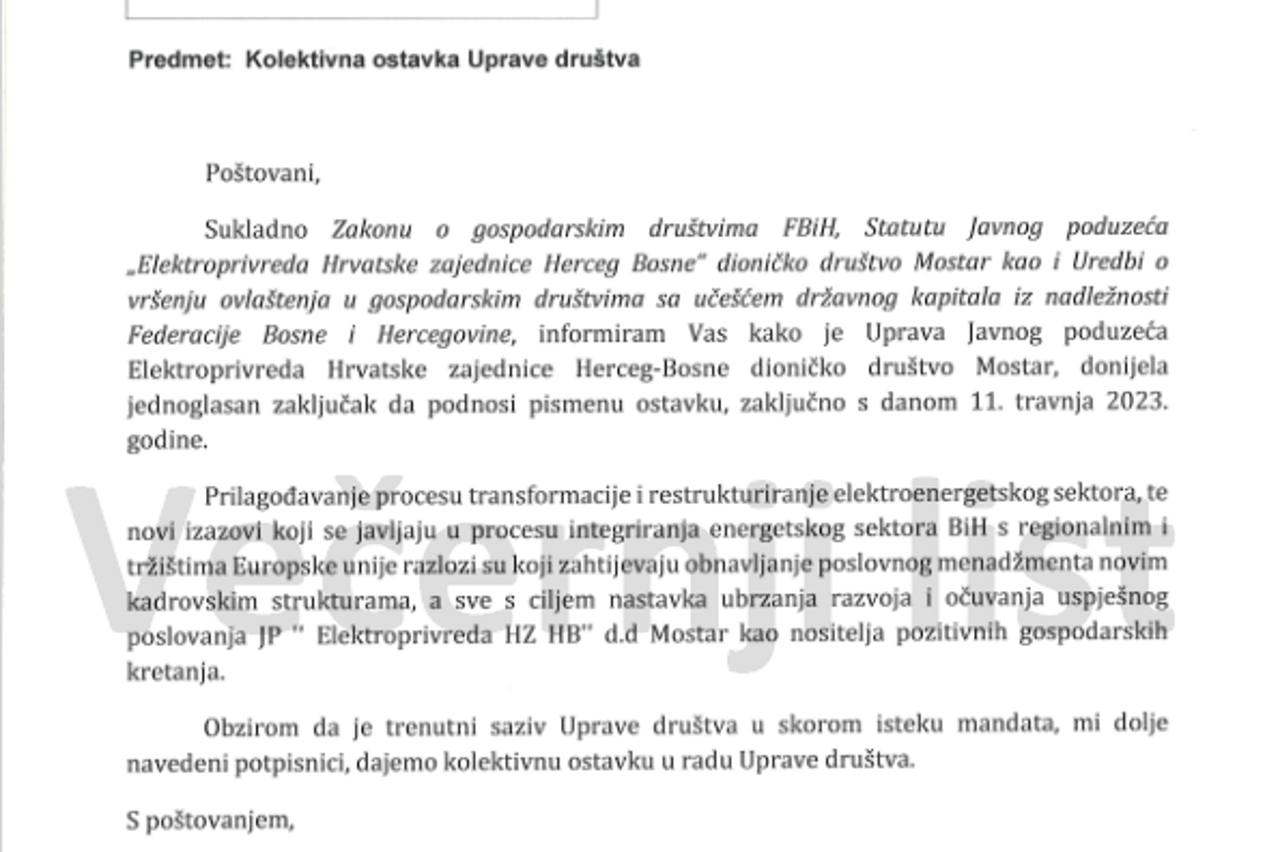 Uprava Javnog poduzeća Elektroprivreda Hrvatske zajednice Herceg - Bosne, dd Mostar, donijela je jednoglasan zaključak da podnosi pismenu ostavku, zaključno s današnjim danom.