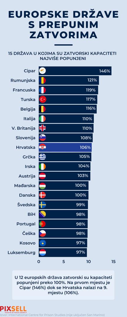 Listu predvodi Cipar sa 146% popunjenosti, a slijede Rumunjska (121%) te Francuska (119%). Slovenija s popunjenošću od 108% drži 8. mjesto, a samo mjesto iza je Hrvatska sa 106%. Na ovoj listi Bosna i Hercegovina se nalazi na 16. mjestu, a zatvori su nam popunjeni 98 posto. Zanimljivo je da su u zemljama poput Francuske, Belgije ili pak Austrije zatvori popunjeniji nego naši. Reklo bi se da smo država sa znatno manje kriminala od onih na Zapadu.