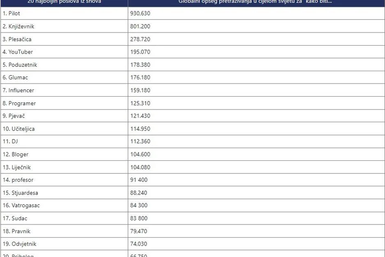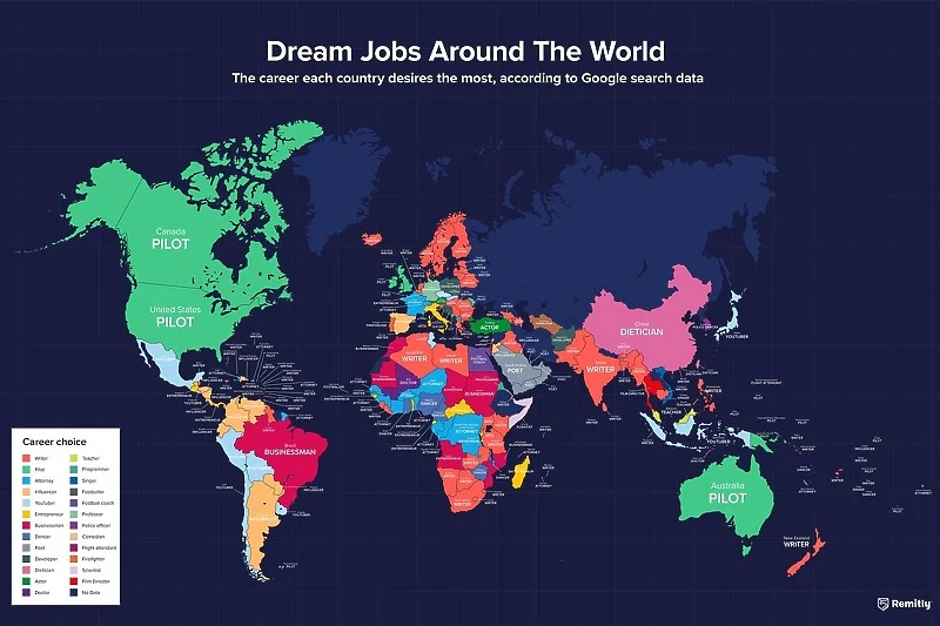 Za zanimanje pilota najviše su se zanimali stanovnici Kanade, SAD-a, Velike Britanije i Australije. Na drugom mjestu je zanimanje pisca/autora, a na trećem su se našli plesači.