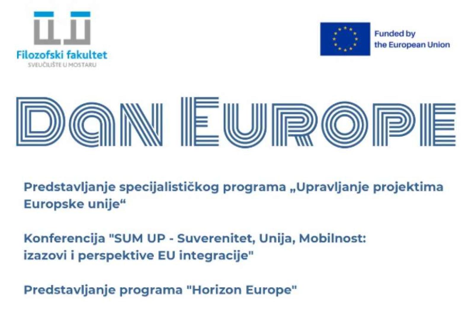 Studij Politologije Filozofskog fakulteta Sveučilišta u Mostaru obilježava Dan Europe nizom događaja koji će se održati u petak, 9. svibnja, na Televiziji Sveučilišta u Mostaru (SUM TV). Program počinje u 10 sati kada će biti  predstavljen specijalistički program „Upravljanje projektima Europske unije“.