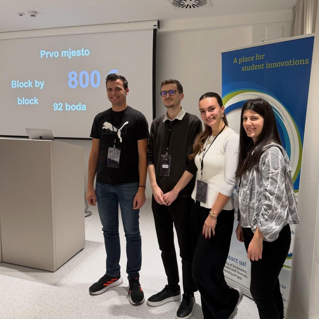 Na prvom Web3 Hackathonu u Splitu, održanom 6. i 7. prosinca u Tehnološkom parku, prvo mjesto osvojio je tim od četvero studenata iz Mostara, troje studenata informatike i jedna studentica računarstva. U konkurenciji multidisciplinarnih timova sa Sveučilišta u Splitu, njihov projekt BlockByBlock istaknuo se kao zrelo, tehnički napredno i društveno relevantno rješenje.