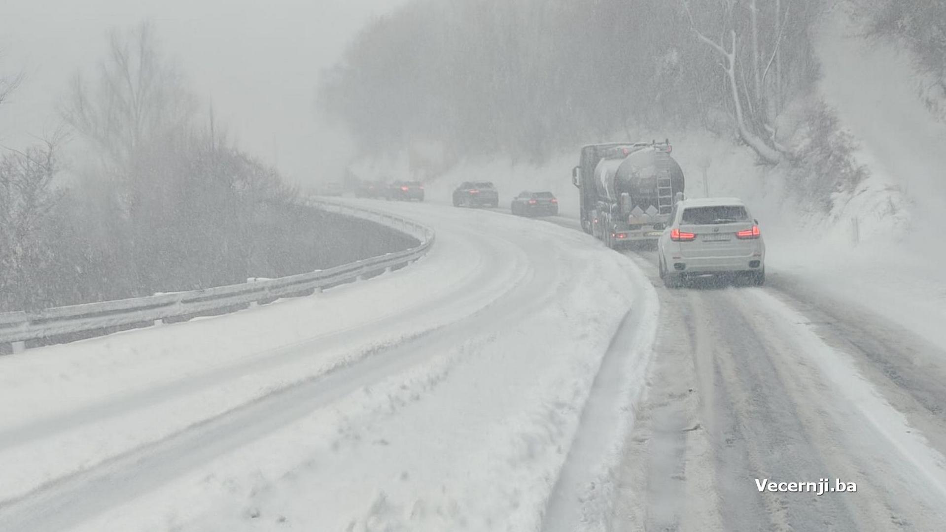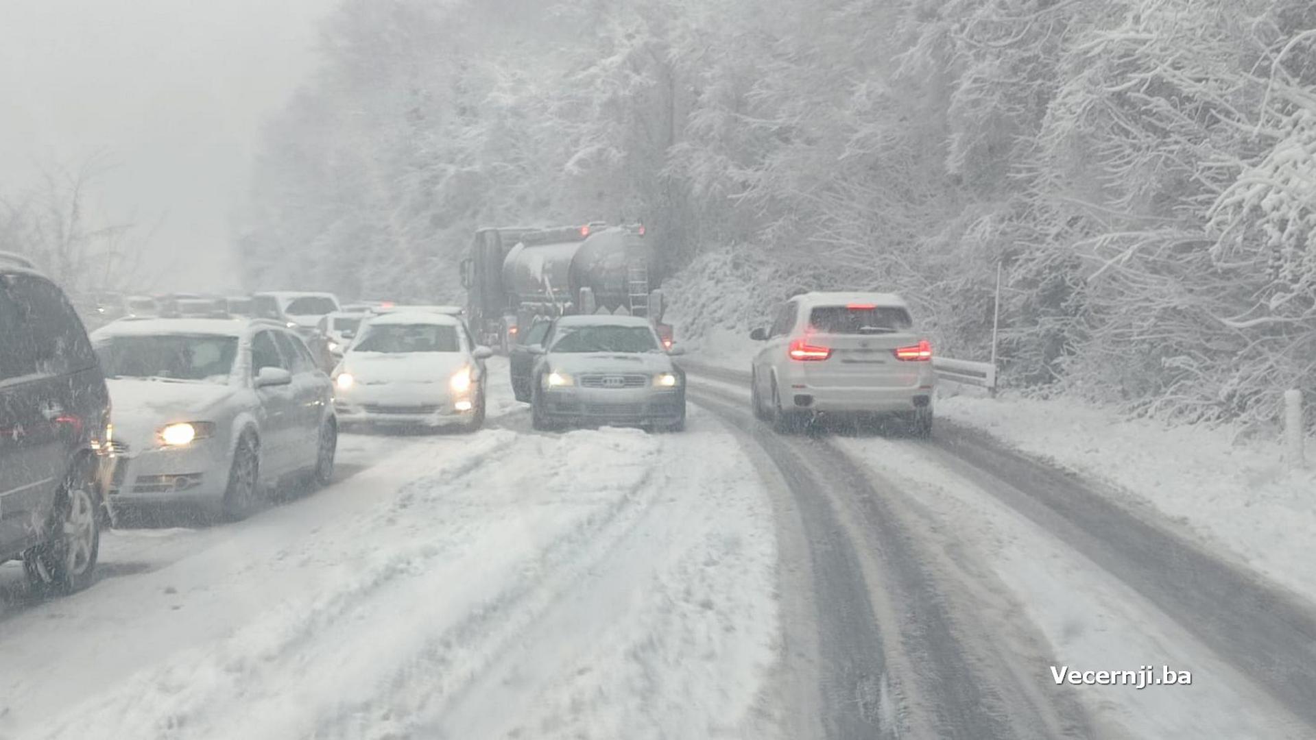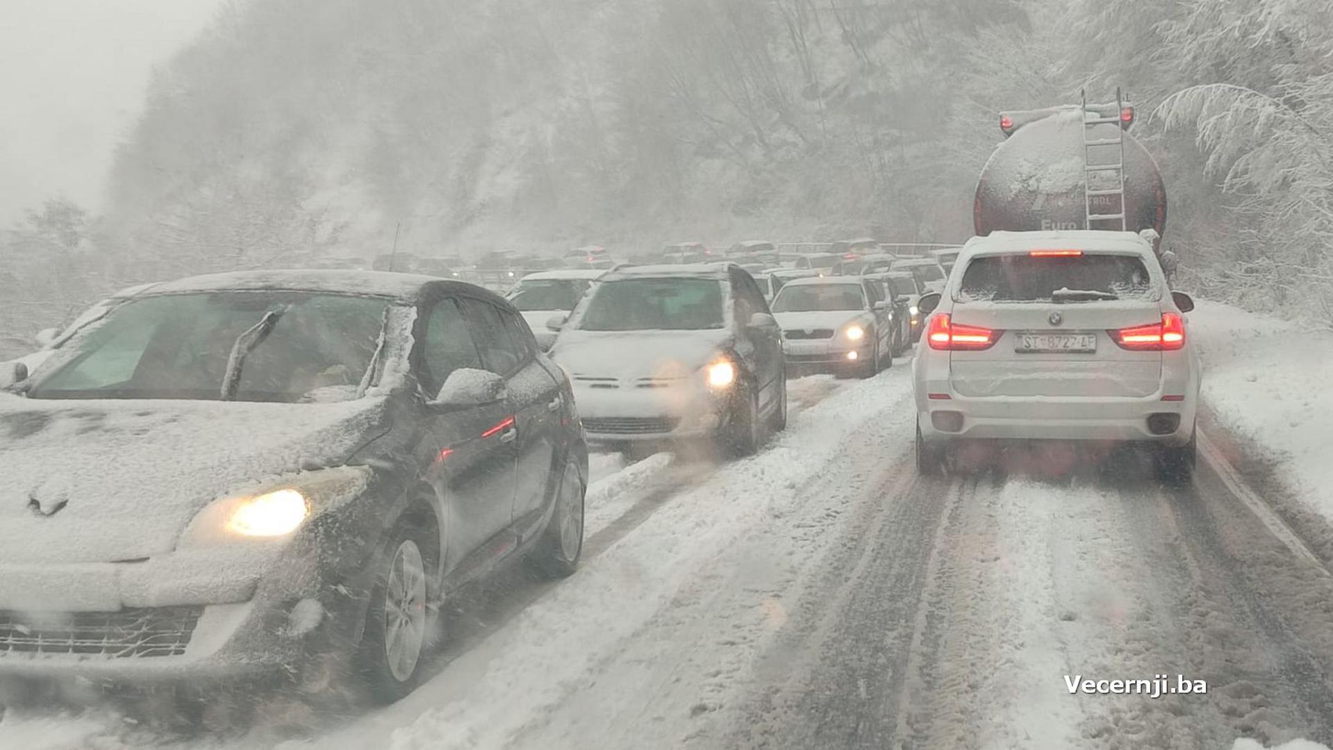 Najkritičnija situacija zabilježena je na prometnici preko Bradina prema Konjicu, gdje se zbog snijega i loših uvjeta na kolniku formirala duga kolona vozila, što je vidljivo i na fotografijama čitatelja portala Vecernji.ba.