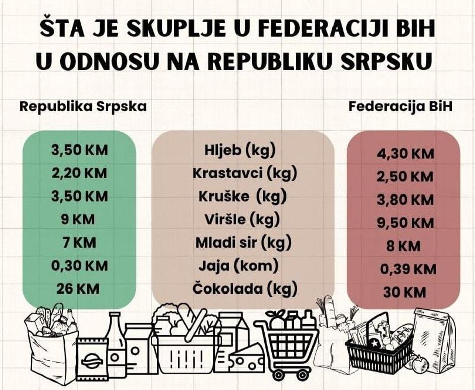 S druge strane, u Republici Srpskoj skuplji su grah, jabuke i banane. Primjerice, prosječna cijena litre mlijeka u marketima RS-a iznosi 2,30 KM, dok je u Federaciji jeftinija i košta 2,16 KM. Više su i cijene pojedinih higijenskih proizvoda poput paste za zube, deterdženta za suđe i deterdženta za rublje.