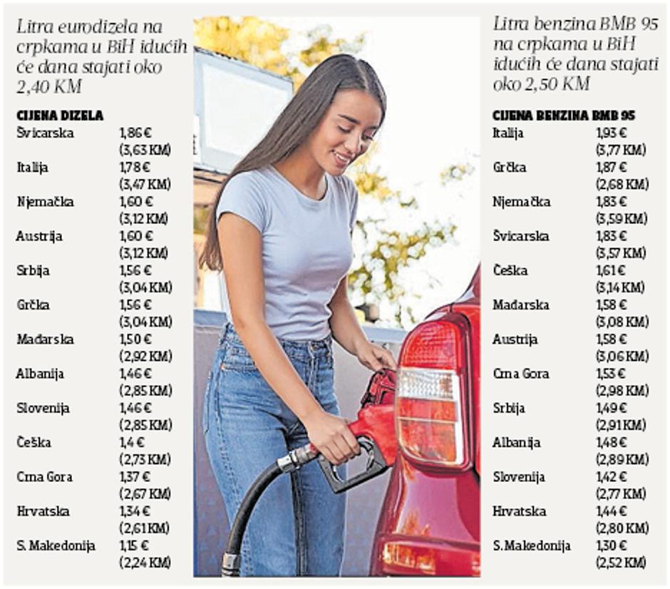 - UNP za spremnike u tom bi slučaju koštao 11,20, a UNP za boce 1,83 eura po litri - ističu. Kompanija Global Petrol Price (GPP) pravi odlične analize cijena goriva u cijelom svijetu. Ažuriranja su svakodnevna te, ako planirate putovanja tijekom ljetnih dana, svakako se navrijeme možete informirati. Portal radiosarajevo.ba izdvojio je cijene goriva u 15 država koje se nalaze u okruženju BiH ili samoj blizini, a popularne su kao atraktivne destinacije za godišnje odmore. Tako litra dizela u Švicarskoj košta 1,86 eura (3,63 KM), Italiji 1,78 eura (3,47 KM), Njemačkoj 1,60 eura (3,12 KM), Austriji 1,60 eura (3,12 KM), Srbiji 1,56 eura (3,04 KM), Grčkoj 1,56 eura (3,04 KM), Mađarskoj 1,50 eura (2,92 KM), Albaniji 1,46 eura (2,85 KM), Sloveniji 1,46 eura (2,85 KM), Češkoj 1,4 eura (2,73 KM), Crnoj Gori 1,37 eura (2,67 KM), Sjevernoj Makedoniji 1,15 eura (2,24 KM), Bugarskoj 1,12 eura (2,18 KM) i Turskoj 0,84 eura (1,64 KM). Dakle, dizel je u samo tri države jeftiniji nego u BiH. Litra benzina BMB 95 u Italiji stoji 1,93 eura (3,77 KM), Grčkoj 1,87 eura (2,68 KM), Njemačkoj 1,83 eura (3,59 KM), Švicarskoj 1,83 eura (3,57 KM), Češkoj 1,61 euro (3,14 KM), Mađarskoj 1,58 eura (3,08 KM), Austriji 1,58 eura (3,06 KM), Crnoj Gori 1,53 eura (2,98 KM) Srbiji 1,49 eura (2,91 KM), Albaniji 1,48 eura (2,89 KM), Sloveniji 1,42 eura (2,77 KM), Sjevernoj Makedoniji 1,30 eura (2,52 KM), Bugarskoj 1,29 eura (2,51 KM) i Turskoj 0,84 eura (1,64 KM). Dakle, i po pitanju benzina jeftiniji je samo u iste tri zemlje.