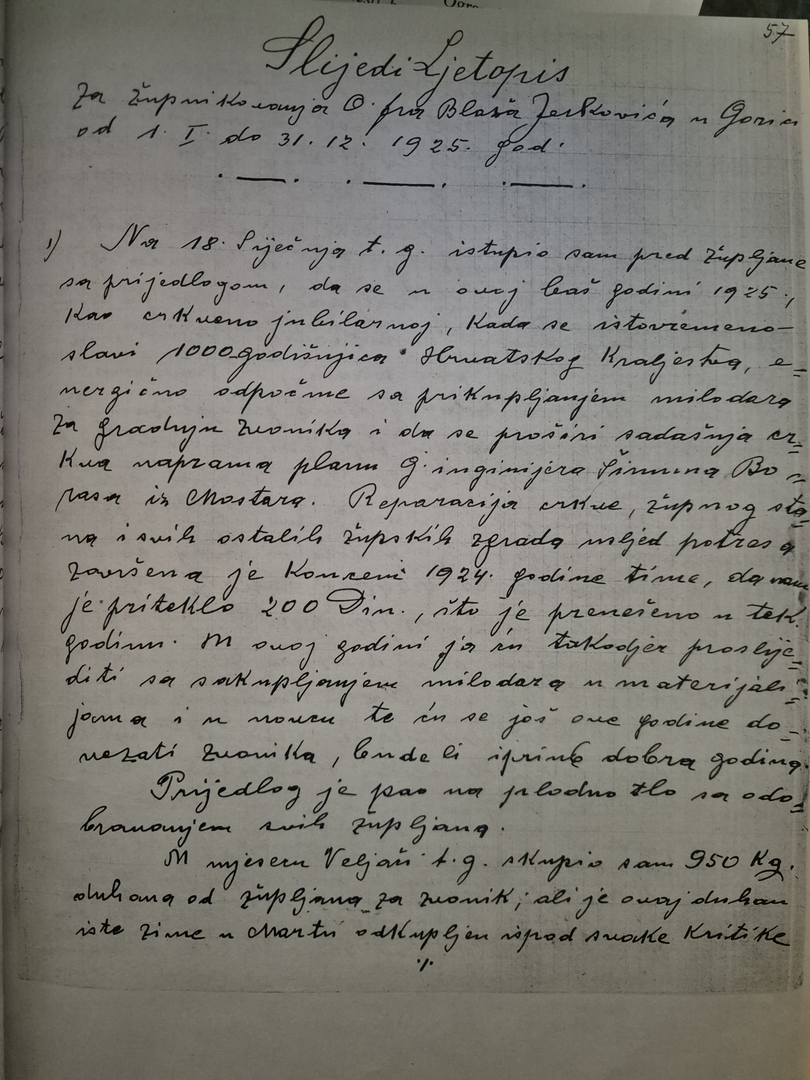 1) Na 18. Siječnja t. g. istupio sam pred župljane sa prijedlogom, da se u ovoj baš godini 1925., kao crkveno jubilarnoj, kada se istovremeno slavi 1000-godišnjica Hrvatskog Kraljevstva, energično odpočne sa prikupljanjem milodara za gradnju zvonika i da se proširi sadašnja crkva naprama planu g. inginiera Šimuna Borasa iz Mostara. Reparacija crkve, župnog stana i svih ostalih župskih zgrada usljed potresa završena je 1924. godine time, da nam je priteklo 200 Din., što je prenešeno u tek. godinu. U ovoj godini ja ću takodjer proslijediti sa sakupljanjem milodara u materijalijama i u novcu te ću se još ove godine dovezati zvonika, bude li iprime dobra godina.