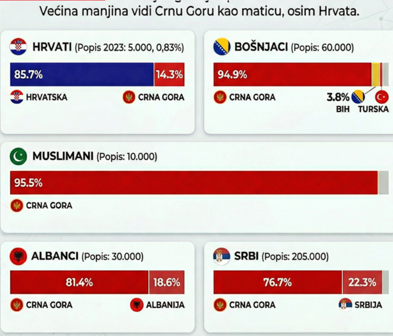 Prema tim podacima, 85,7 posto ispitanika koji se izjašnjavaju kao Hrvati smatra Hrvatsku svojom matičnom državom, dok je za njih 14,3 posto matica Crna Gora. U toj zemlji, prema popisu iz 2023. godine, živi nešto više od pet tisuća Hrvata, odnosno 0,83 posto ukupnog broja stanovnika.