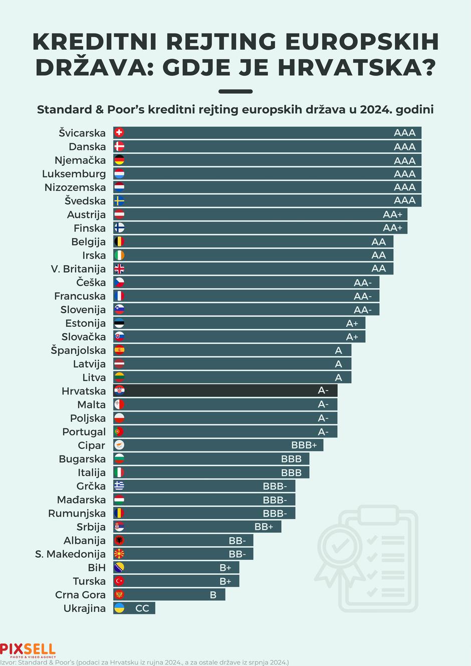 Najbolji kreditni rejting među europskim državama - AAA imaju Švicarska, Danska, Njemačka, Luksemburg, Nizozemska i Švedska. Infografika prikazuje kreditni rejting europskih država u 2024. godini. Pri dnu ljestvice nalaze se Ukrajina, Crna Gora, Turska i BiH. Hrvatska najbolje stoji u okružju, pozicionirana je na 20. mjestu. Mnogo lošije od nje su Srbija (30. mjesto) s kreditnim rejtingom BB+, isti rejting ima Sjeverna Makedonija (32.). BiH ima rejting B+ (na 33. mjestu), dok najlošije stoji Crna Gora (35.), čiji je rejting B. Povećana potrošnja, koja bi trebala biti podržana sniženom inflacijom i rastom realnih plaća, povećat će realni rast u BiH na 2,8% u ovoj godini. Ovo se, među ostalim, navodi u izvješću međunarodnih rejtinških agencija Moody’s i Standard and Poor’s (S&P) koje su potvrdile kreditni rejting BiH sa stabilnim izgledima.