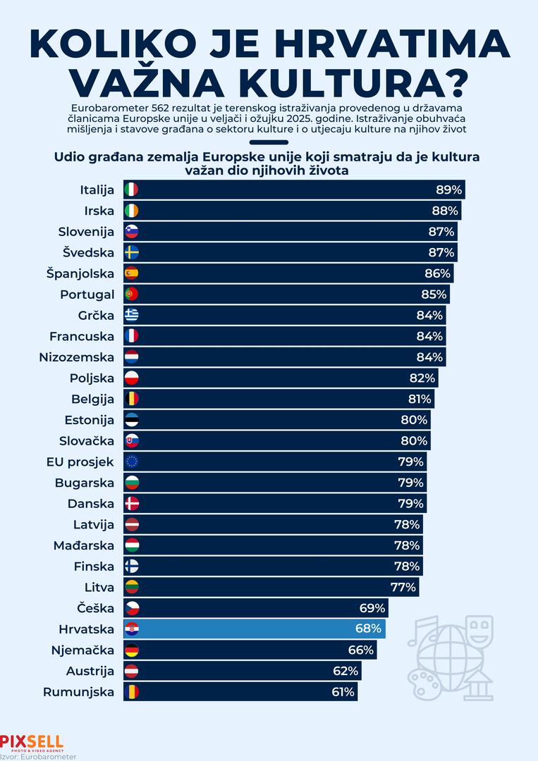 Prema istraživanju Eurobarometra, Hrvatska se nalazi pri dnu ljestvice po broju građana koji kulturu smatraju važnim dijelom svog života - tek 68% ispitanika tako misli, što je značajno ispod europskog prosjeka od 79%. Kulturu najviše cijene Talijani (89%), zatim Irci (88%) i Slovenci (87%), dok su samo Nijemci (66%), Austrijanci (62%) i Rumunji (61%) ispod Hrvata.