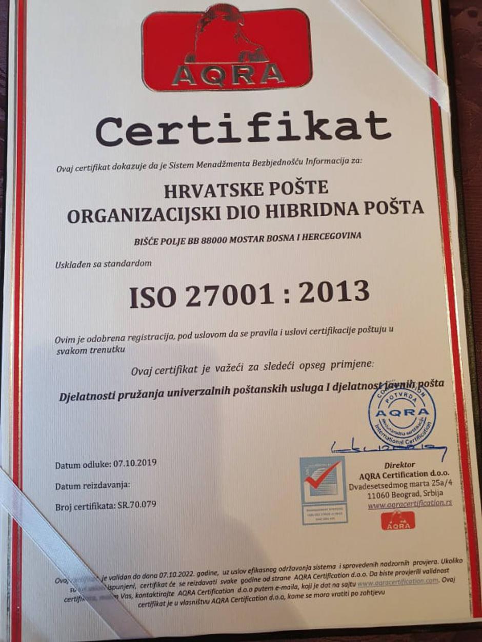 Ovim certifikatom je potvrđena učinkovita implementacija sustava upravljanja informacijskom sigurnošću čime je potvrđen dugoročan strateški cilj Hrvatske pošte Mostar.