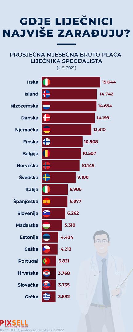 Infografika pokazuje gdje liječnici najviše zarađuju. Dok je prosječna mjesečna bruto plaća liječnika u Irskoj 2021. godine iznosila je 15.664 eura u Hrvatskoj je taj iznos bio 3.768 eura što je Hrvatsku stavilo tek na 17. mjesto.