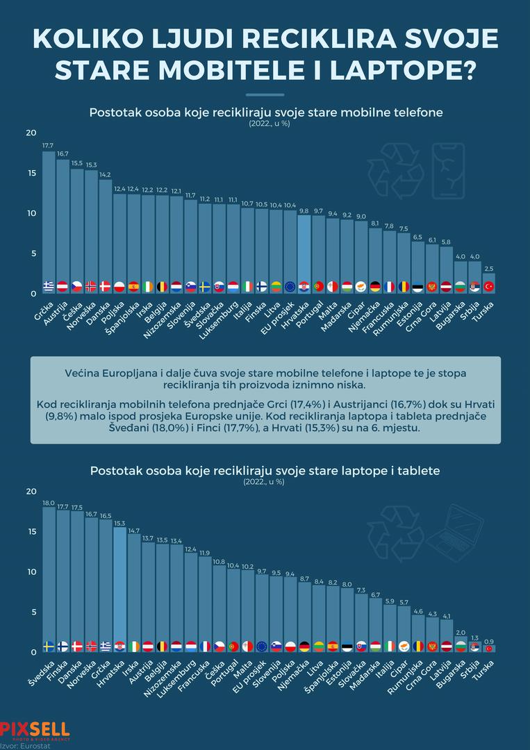 Infografika koju je napravio Pixsell prikazuje postotak osoba koje recikliraju svoje stare mobilne telefone, laptope i tablete u 2022. godini.