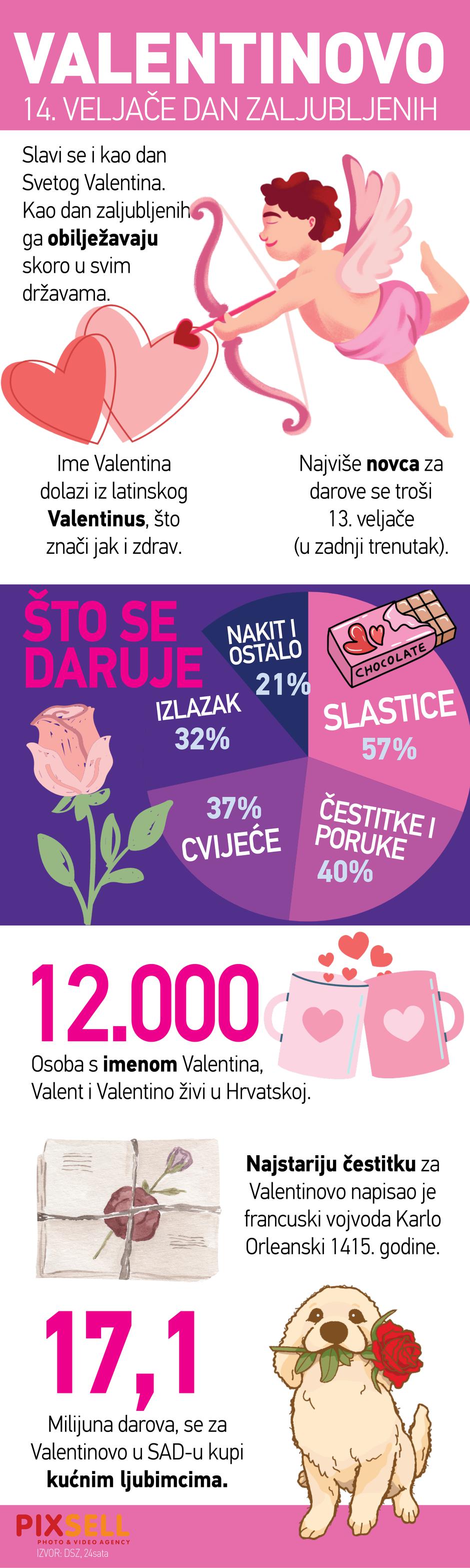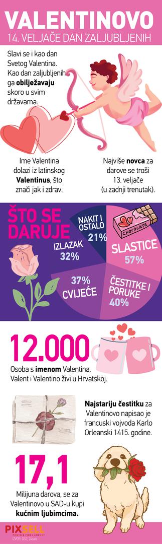 Infografika prikazuje zanimljivosti i podatke koji se vežu uz Valentinovo. Najčešći pokloni za Valentinovo su slastice, čestitke i ljubavne poruke, cvijeće te izlazak u paru. Sve učestalije je darivanje kućnih ljubimaca pa se tako u SAD-u kupi više od 17 milijuna darova za kućne ljubimce. Photo: Stjepan Banovic/PIXSELL