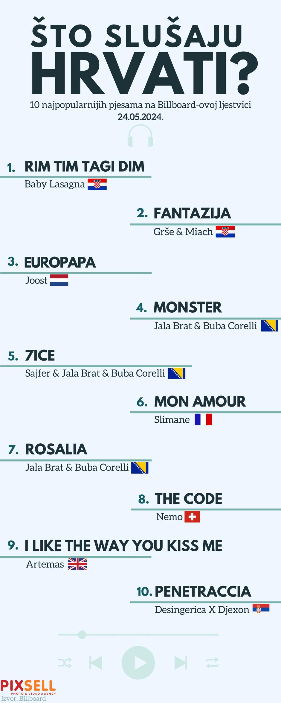 Infografika prikazuje 10 najpopularnijih pjesama na Billboardovoj ljestvici koje su slušali Hrvati u periodu do 24. svibnja 2024. godine.