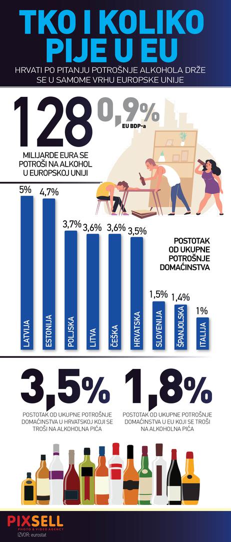 Prema podacima Eurostata 128 milijardi eura se potroši se na alkohol u Europskoj uniji. Hrvatska je, s udjelom od 3,5%, među zemljama čija kućanstva na potrošnju alkohola troše najviše svojih prihoda. Više nego u Hrvatskoj, za alkohol su spremni izdvojiti samo Litvanci, Estonci, Poljaci, Česi i Latvijci.